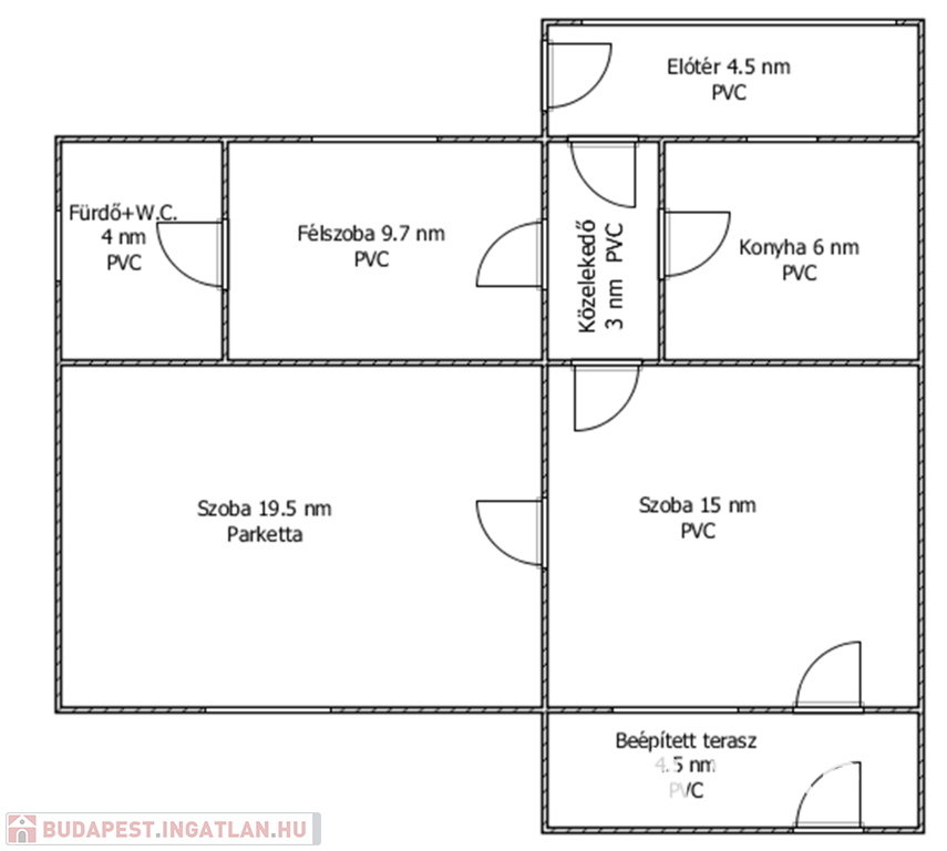 Helyiségei: 2 szoba, 1 félszoba, konyha, közlekedő, fürdőszoba, előtér, beépített terasz.