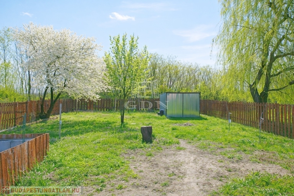 A kertben egy kis faház és egy bádog tároló is helyet kapott, amelyek további tárolási lehetőséget biztosítanak.