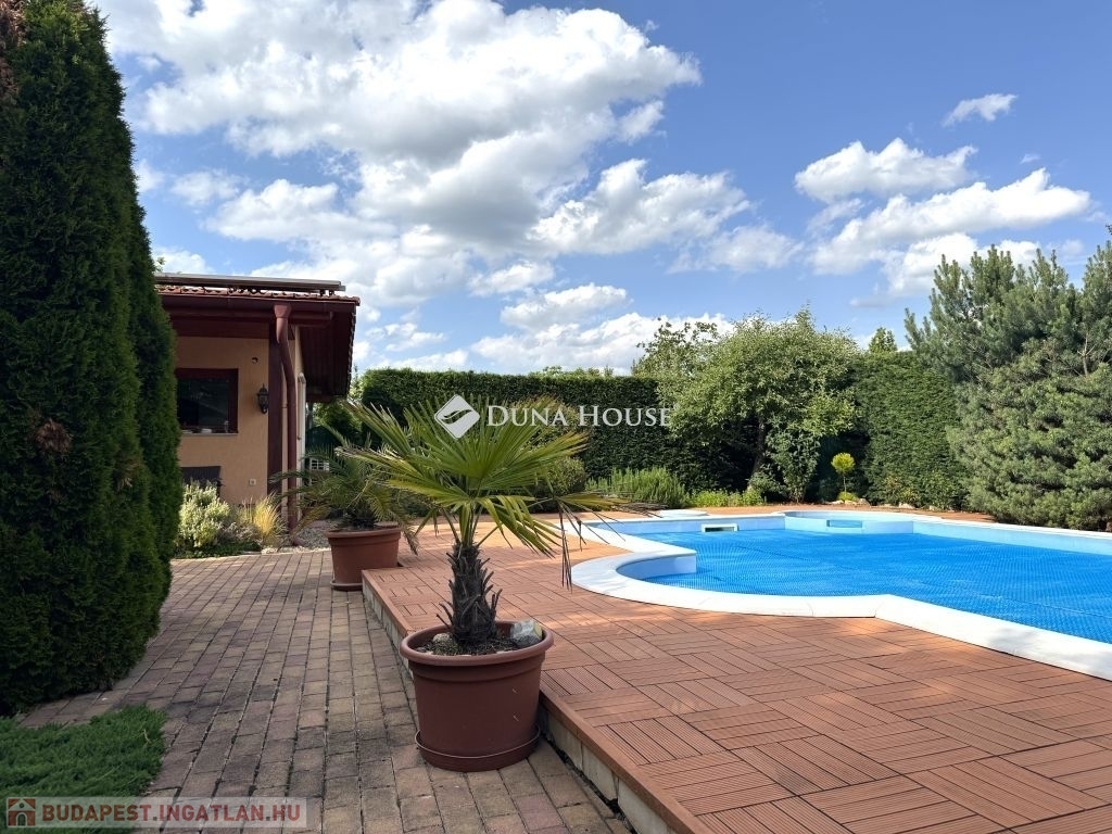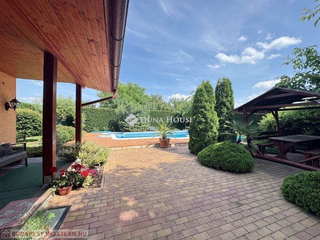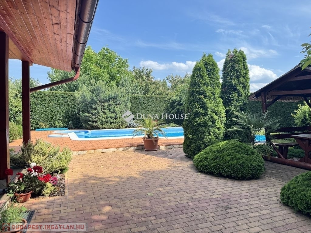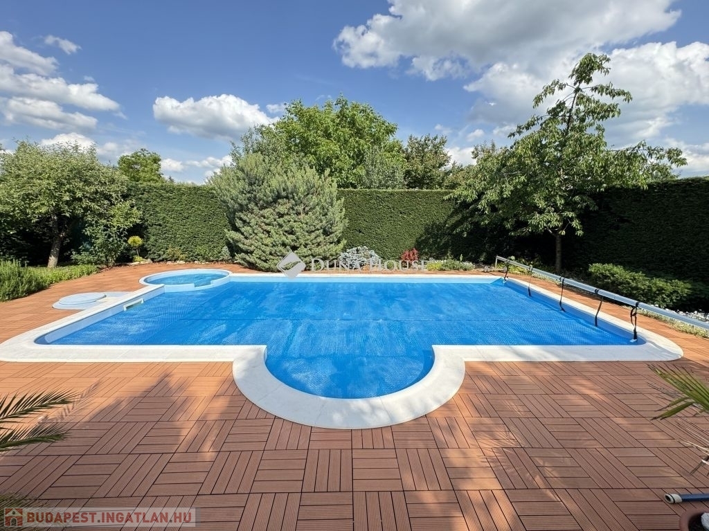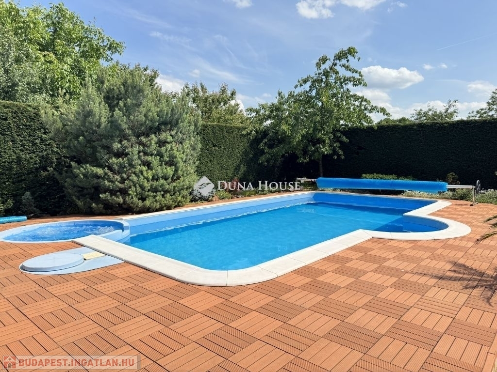 A külső tér ugyanilyen átgondolt: a parkosított kertben egy 4×8 méteres, 1,5 méter mély medence kapott helyet jakuzzival, amely tökéletes a nyári felfrissüléshez vagy egy nyugodt esti lazításhoz.