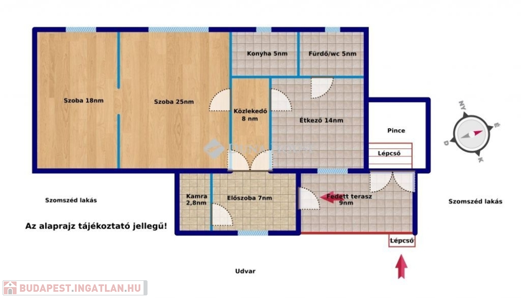 Ez a világos, tágas, 2 szobás lakás külön étkezővel rendelkezik. A szobákat és a közlekedőt parkettákkal látták el, míg a konyha, fürdő/WC, kamra, előtér és a fedett, nyitott terasz praktikusan hidegburkolatot kapott.