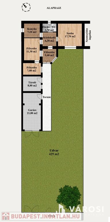 Az ingatlan egy 2 lakásos társasház egyik lakása, amely saját, kizárólagos használatú, 429 m2 területű telekrésszel rendelkezik. Az udvar az utcáról, saját bejáraton keresztül közelíthető meg, így gyakorlatilag teljesen önálló az ingatlan, a társasház másik lakásától teljesen elkülönített, független. Jogilag rendezett, társasházi alapító okirattal rendelkezik.