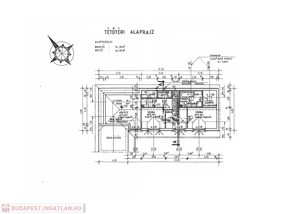 Az épület tetőtere 46 m2 hasznos területű, három hálószoba, egy fürdőszoba, szárítóhelyiség/mosókonyha került kialakításra.