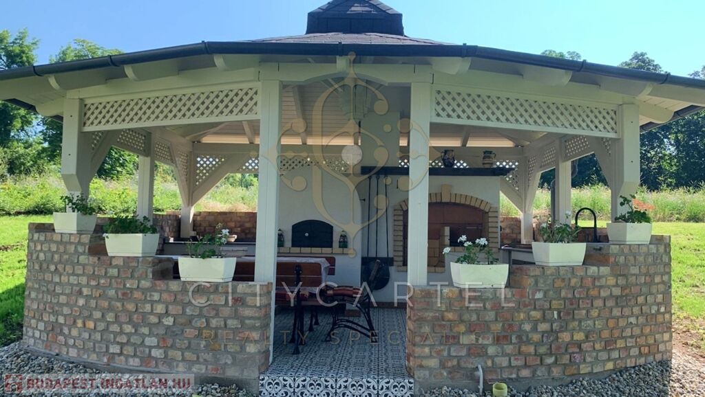A vendégház (kiskastély) kb. 180 nm, ahol egy nagy nappali, étkező, konyha, két hálószoba és két fürdőszoba kapott helyet.
