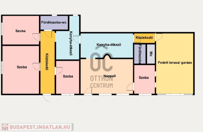 A belső elrendezés: 3 szoba, konyha-étkező, fürdőszoba WC-vel, közlekedő.