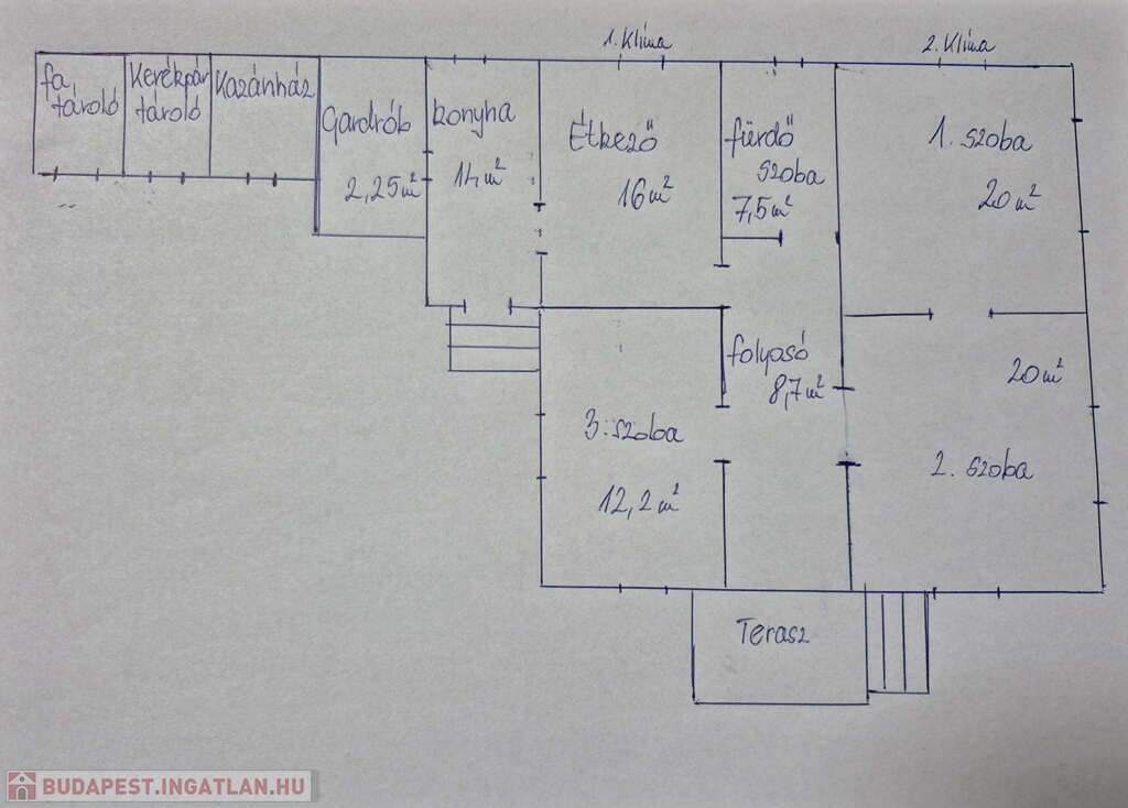 Helyiségek: konyha, étkező, fürdőszoba+wc, 3 szoba (amelyből az egyik nappaliként funkcionál), folyosó, gardrób,