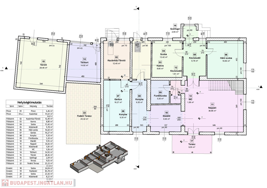 A lakóházzal egybeépített garázsban egy jármű fér el, külön egy kisebb garázs, műhely tároló helyiség található.