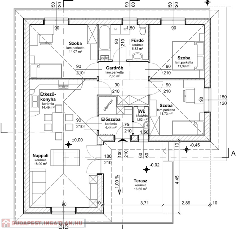 Nappali + 3 hálószoba (14, 11, 12 nm), fürdőszoba WC-vel + külön WC.