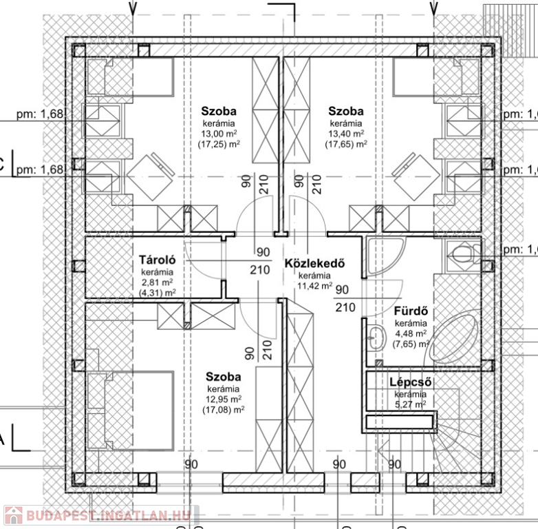 Emelet tetőtér beépítésű, 3 hálószobából kettő tetőtéri ablakkal, egy pedig rendes oldalfali ablakkal ellátott. Hasznos alapterületük 17 nm körüliek. Ezen a szinten van még egy 7 nm-es fürdő WC-vel, illetve egy tároló-gardrób helyiség (4,31 nm)