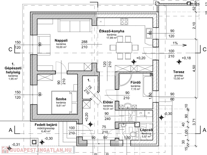 Földszinten: hatalmas előszoba (10,51 nm), nappali (18nm), konyha-étkező (17,89 nm), vendégszoba (9,61 nm) fürdő (7,15 nm) külön WC