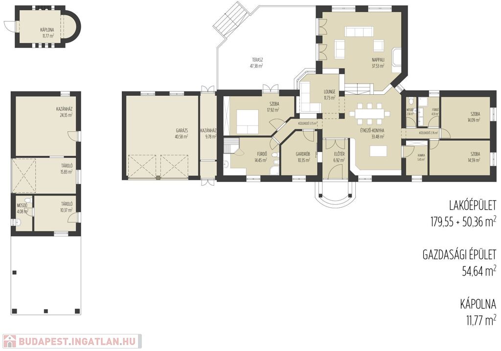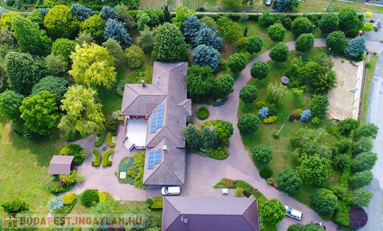 Telek: Az épülethez számos melléképület kapcsolódik: kétállásos garázs, fedett kocsibeállók, tágas tárolók, kazánház, valamint egy külön épület, amely jelenleg nyárikonyhaként és fatárolóként funkcionál, de akár önálló lakórésszé is alakítható. A 15.000 m2-es telek teljesen körbekerített, három autóbejárattal, távirányítható kovácsoltvas kapukkal, térkövezett úthálózattal rendelkezik. A kert fenntartását fúrt kút 40m-es mélységgel, 25 méteres bőhozamú vízoszloppal és egy 20 m- es ásott kút, valamint egy 50 köbméteres esővízgyűjtő ciszterna segíti, az öntözőrendszer az egész területre ki van építve. A birtokon még egy betemetett, de bármikor használatba vehető kültéri medence is található teljes gépészettel, valamint pince és egy romantikus kerti filagória.