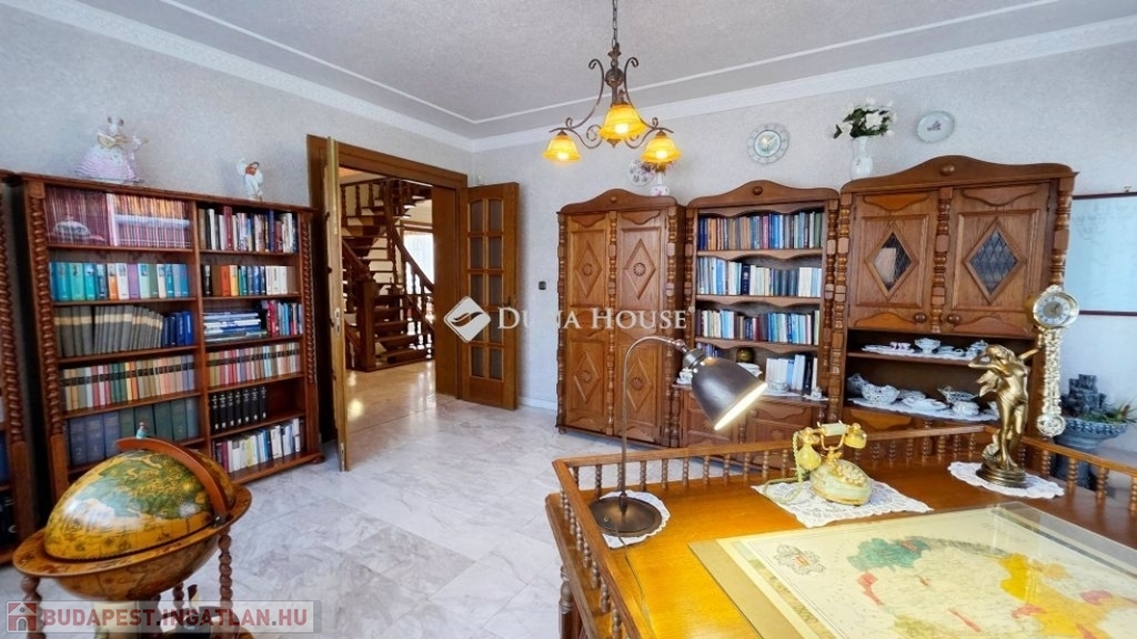 A földszinten többek között van egy tágas konyha-étkező, egy 50 m2-es nappali, egy dolgozószoba, fürdőszobák, innen egy impozáns, ívelt lépcső vezet az emeletre, ahol négy napfényes hálószobát, konditermet, 3 fürdőszobát, közösségi helyiségeket, erkélyeket találunk.