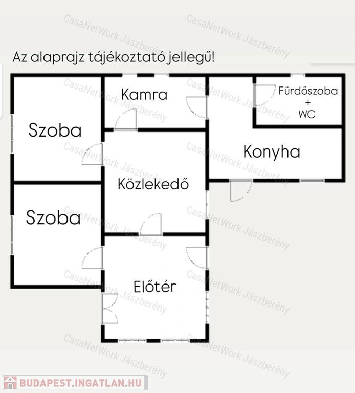 - Helyiségek: előtér, közlekedő, 2 szoba, fürdőszoba + WC, konyha, kamra