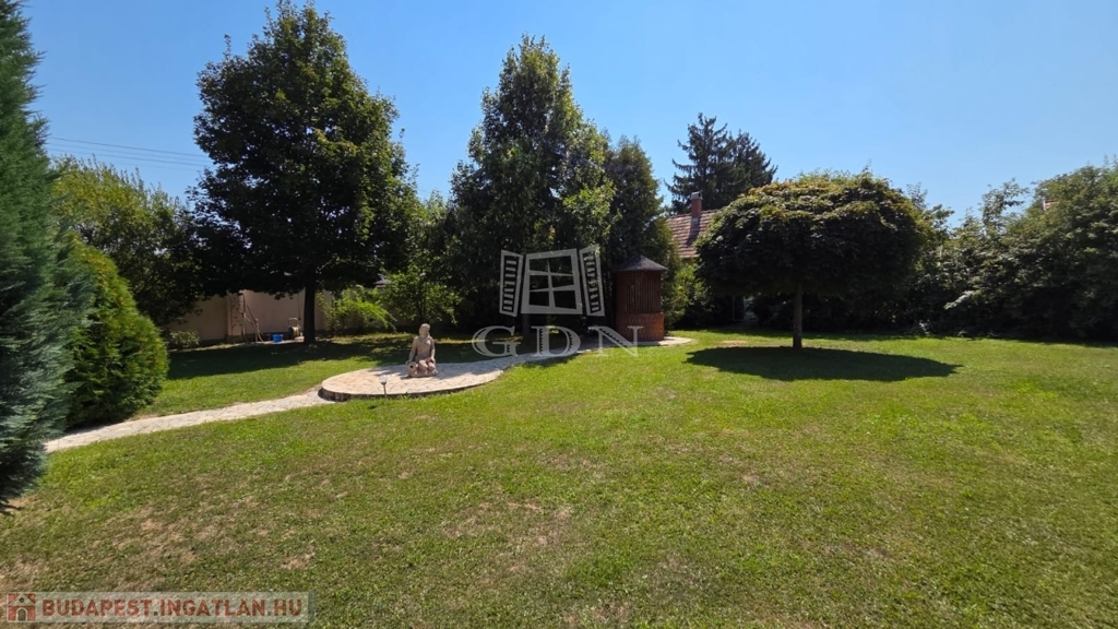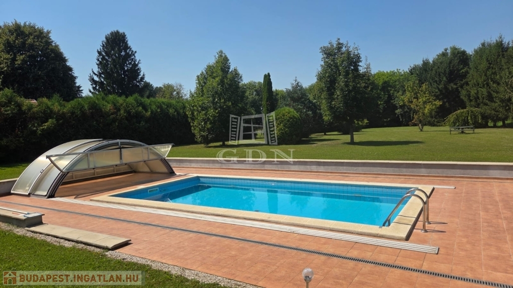 A gondosan kialakított kertben nagy méretű medence, ápolt zöld területek, dupla kocsibeálló, valamint további udvari parkolóhelyek találhatók. A teljesen felszerelt melléképület vendégházként vagy hobbihelyiségként is tökéletesen használható.