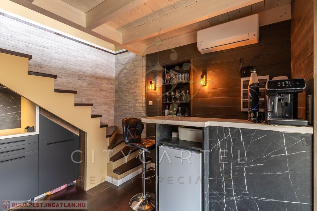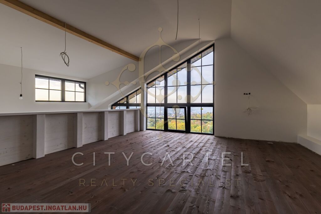 - A felső szinten egy kádas fürdőszoba, valamint egy galériás, jelenleg nyitott, de igény esetén könnyedén zárttá alakítható 34 nm-es szoba kapott helyet.