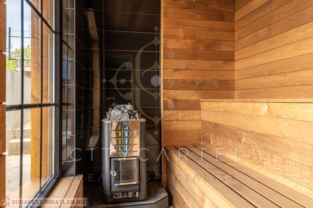 - A földszinten előtér, kis konyharész, zuhanyzós fürdőszoba, valamint egy fával fűthető szauna kapott helyet, amelyet úgy alakítottak ki, hogy az onnan áradó meleg levegő az egész épület fűtésére is alkalmas legyen – tudatosan megtervezett, különleges és otthonos megoldásként.