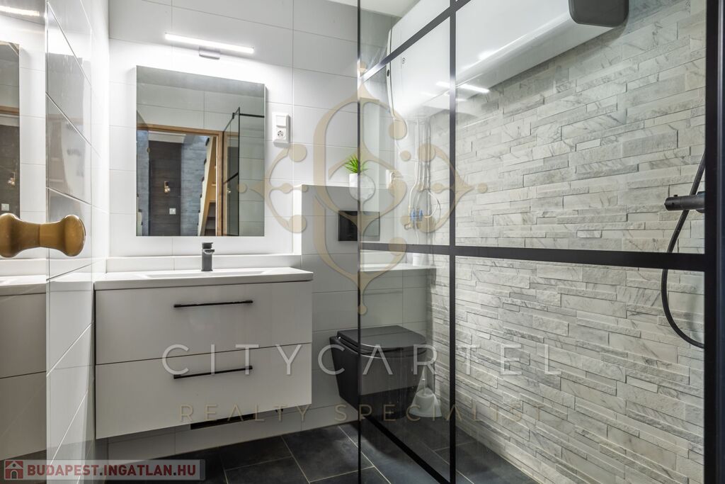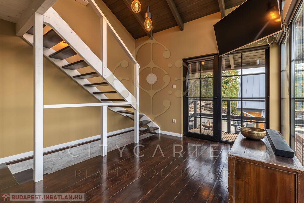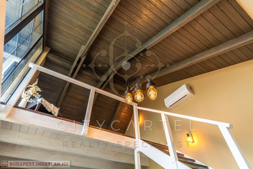 - A felső szinten egy kádas fürdőszoba, valamint egy galériás, jelenleg nyitott, de igény esetén könnyedén zárttá alakítható 34 nm-es szoba kapott helyet.