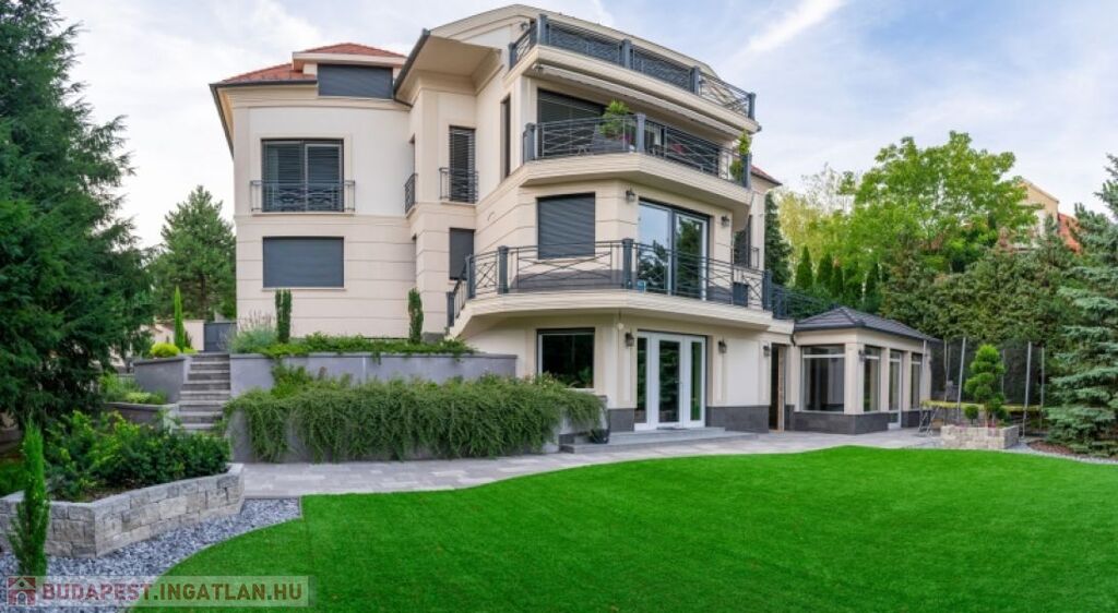 Budapest, II. in one of the most popular parts of the district, on the southern hillside, in a low-traffic, calm, quiet, family-run area, next to elegant buildings, in an exclusive area popular with embassies, far from city noise and polluted air, close to nature reserves, but only 3 km away from the city center, with excellent transport links, for sale is a 550 sqm American-style, representative-looking, classic-looking, 4-storey, premium category, luxury villa with lots of extras, eternal panorama.