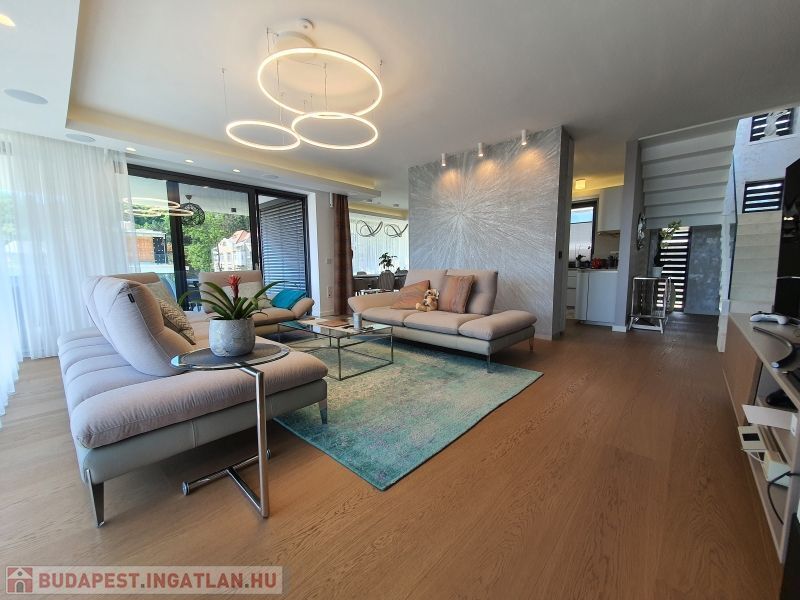 A 600 m2, 3-apartment, panoramic, minimal design luxury villa with elevator, built in 2021 is for sale at 2nd district Rézmál on a 1,005 m2 lot, accessible from two streets, with sophisticated interior design solutions, a 4-space garage.