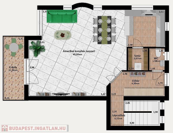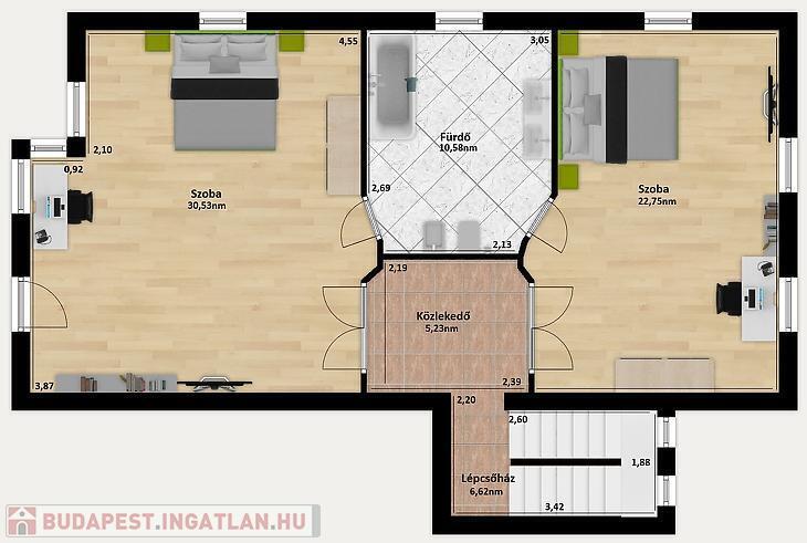 A tetőtér 58nm, ahol szintén 2 nagyméretű hálószoba és egy fürdőszoba kapott helyet.