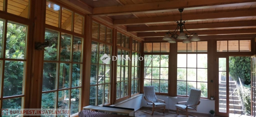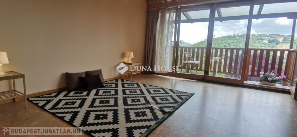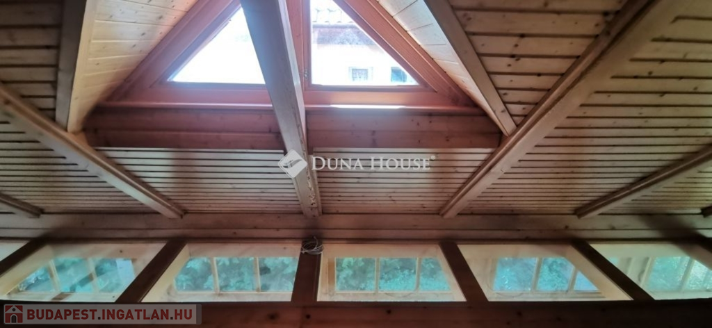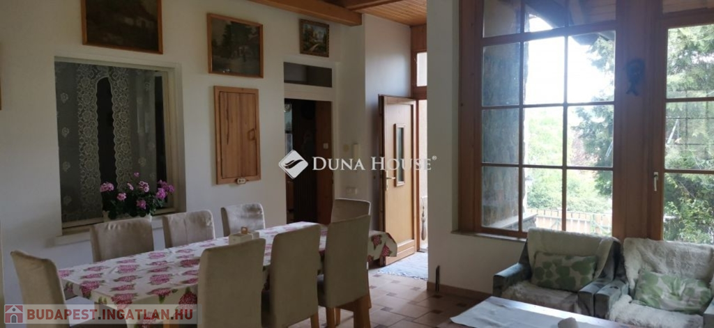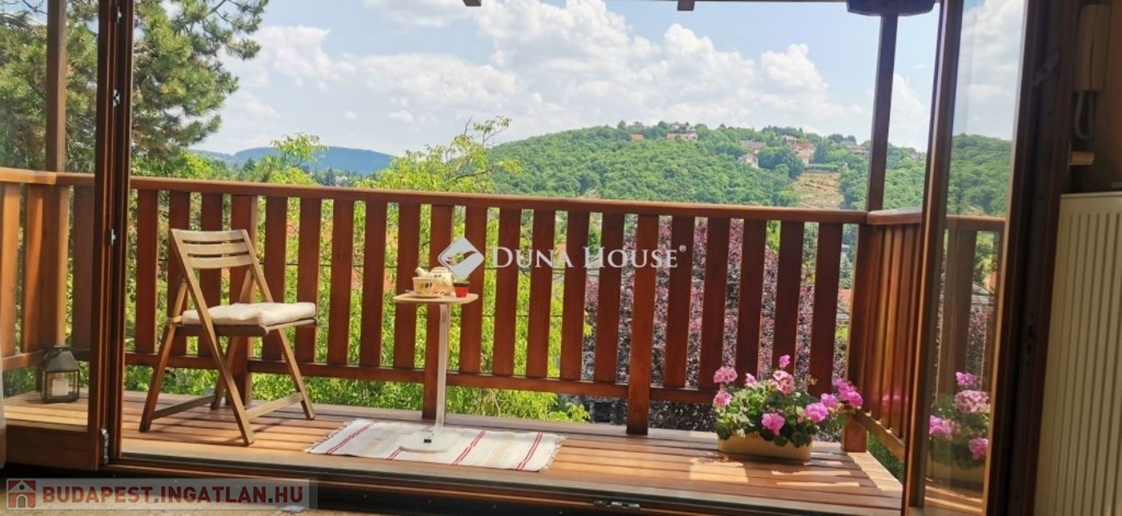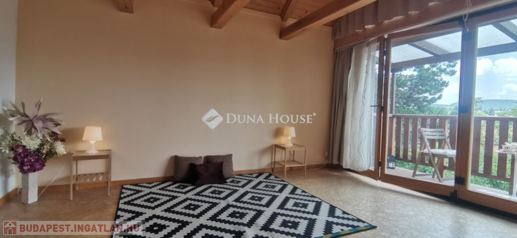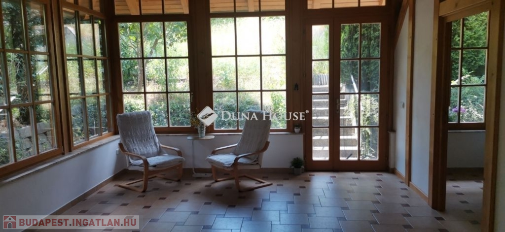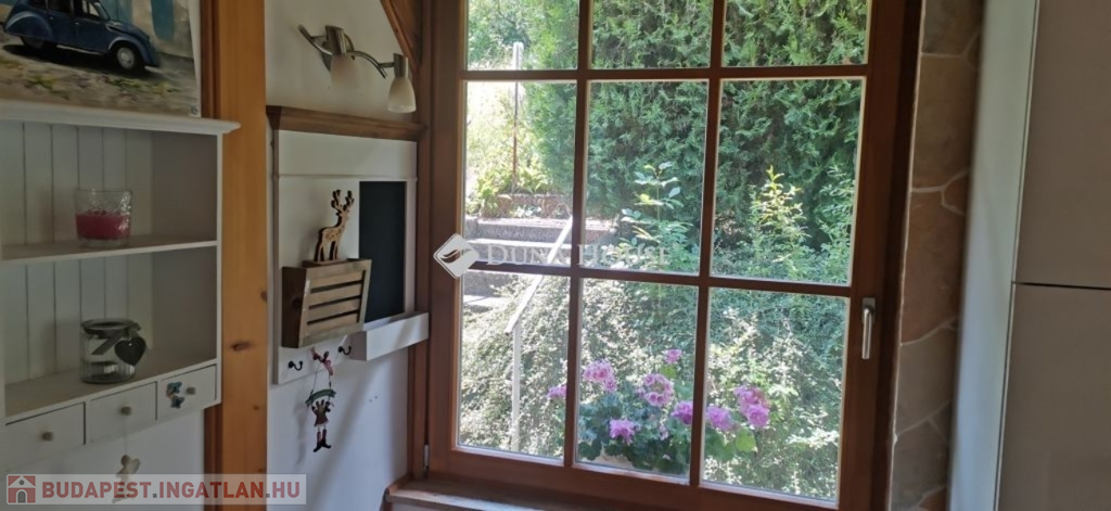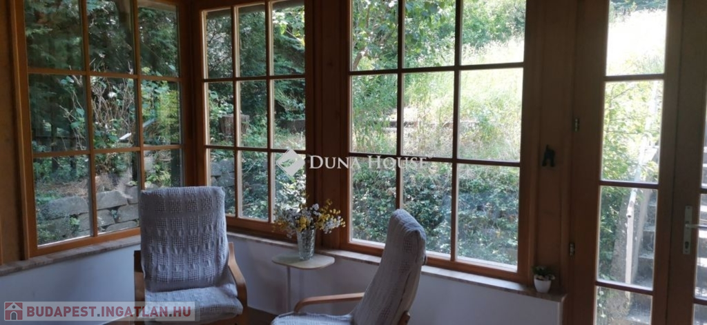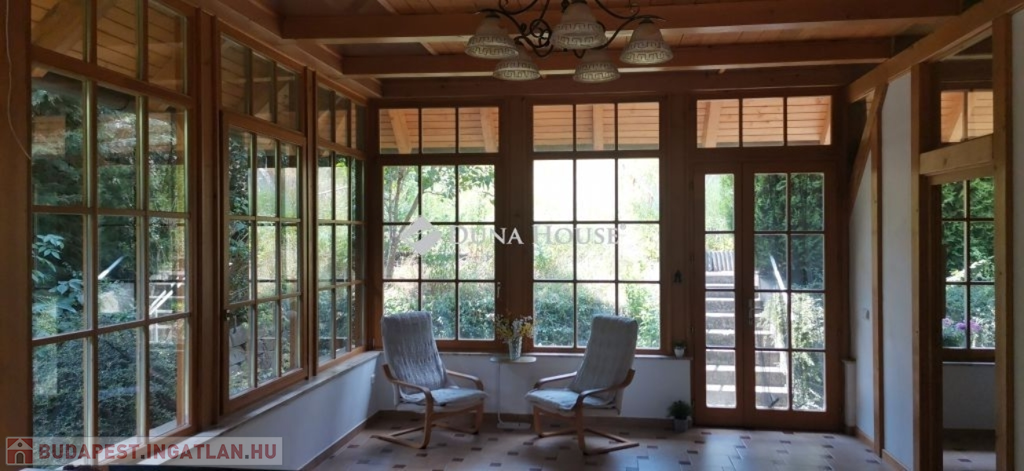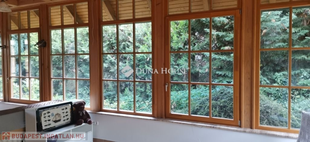 A ház 2005-ben épült, egyedi kialakítású, tetőtér beépítéses, kétszintes tégla családi ház. Az ingatlan egyik nagy előnye, hogy akár két generáció együttélésére is alkalmas. Együtt de mégis külön! A házat egy hatalmas kert, borospince, nagyméretű garázs, valamint további autóbeállási lehetőség teszi még kényelmesebbé a nagycsaládosok számára.Fűtése, meleg víz ellátása gáz cirkóval megoldott, a földszinten padlófűtéssel kiegészítve.A két generációs házban az egyik lakrész 35 m2 nagyságú, a földszinten a bejárattól jobbra található, amely áll egy előtérből nyiló szobából, konyhából és fürdőszobából, wc-vel. A konyhából egy átadó ablak nyílik a nappaliban lévő étkezőasztal felé, amely a családi összejöveteken praktikus megoldás a vendégek kiszolgálására. A nappali különös hangulatát a három oldalán elhelyezkedő kazettás fa ablakok adják, melyek révén mintha közvetlenül a fák tövében ülnénk, miközben szemlélhetjük a természet zöldjét az énekesmadarak, a mókusok játékát. Igazán különleges érzés, bent vagyunk, de mégis kint érezzük magunkat!A másik lakrészhez tartozó konyha a tágas nappali túloldaláról nyílik, amely a hátsó kertre nyílik és az oldalkertre néz, modern és kényelmes U-alakú elrendezésével. Itt található még egy háztartási helység és egy wc mosdóval. Innen jutunk fel a kétkarú lépcsőn az emeletre, amely egy egy légterű, fenyőfával burkolt tetőtéri nappali dolgozósarokkal. Ez egy légkondcionálóval ellátott, napfényes, hatalmas belső tér, amely sok lehetőséget rejt magában, plusz érdekes megoldás, hogy körben üvegpadló van, amely a fölszinti nappalit is plusz természetes fénnyel látja el. Nagyon hangulatos, a fényképek nem adják vissza, hogy mennyivel növeli a térérzetet ez a különleges padló kialakítás.A felső szinten ezen kívül egy kisebb szoba, gyerekszoba található, melllette zuhanyzós fürdőszoba wc-vel és a hálószoba a teljes faltól-falig tartó diófa terasszal! Erről a fedett teraszról is lenyűgöző, örökpanorámás kilátás nyílik a budai hegyekre, amelyet a teljes szélességében eltolható nyílászárókkal élvezhetünk maximálisan. A kert hatalmas, kissé emelkedik felfelé a kert vége felé, felúton a domboldali borospince, amely egy földdel borított boltíves hobbit pince.A ház szigetelt, szépen bevakolt, nagyon jó állapotban van, a tulajdonosok építették a család részére, kezdetnek nyaralóként, aztán állandó lakhelyként szolgált. Jelenleg nem lakják az ingatlant, gyorsan birtokba vehető. A környék csendes, pár utcával odébb található buszjárat 10 perc alatt Hűvösvölgyben van, onnan a város fél óra alatt elérhető. A közelben óvoda, iskolák, kisebb boltok, éttermek, szolgáltatók megtalálhatóak és persze rengeteg kirándulási lehetőség.Nézzük meg együtt, ne maradjon le erről a hangulatos, egyedülálló ingatlanról! Töltse már itt a nyarat!