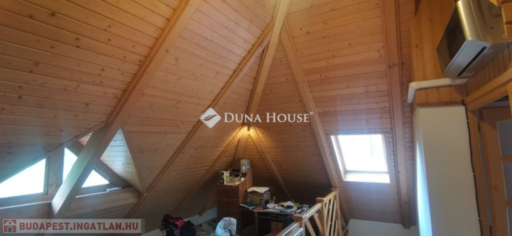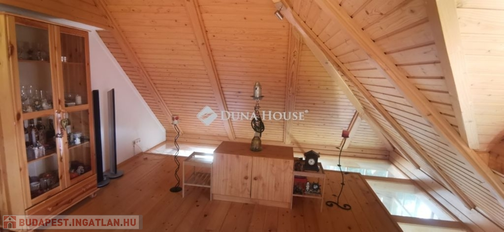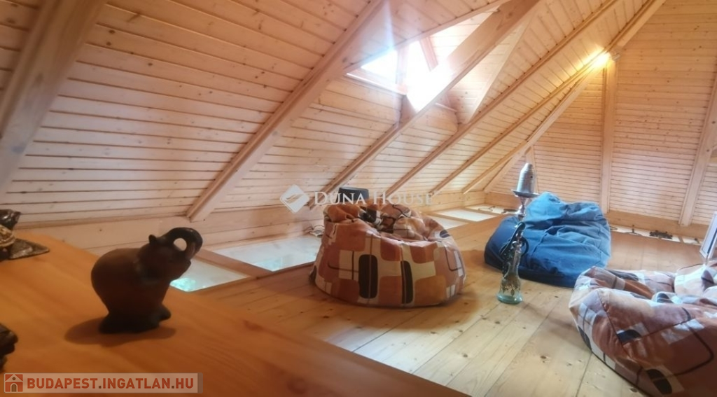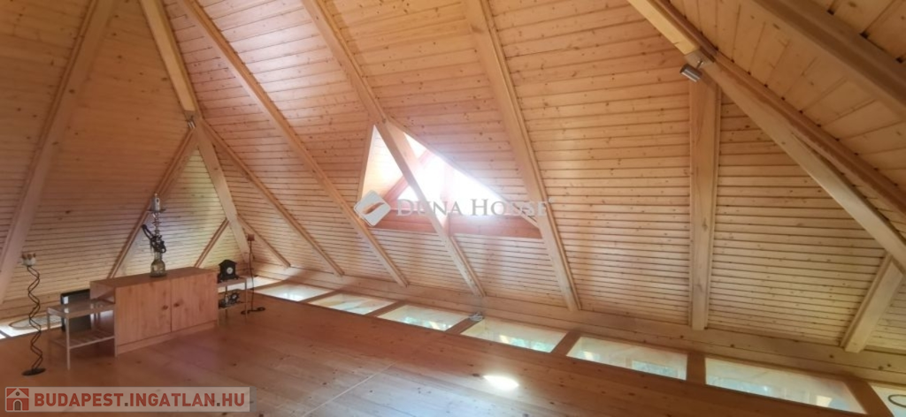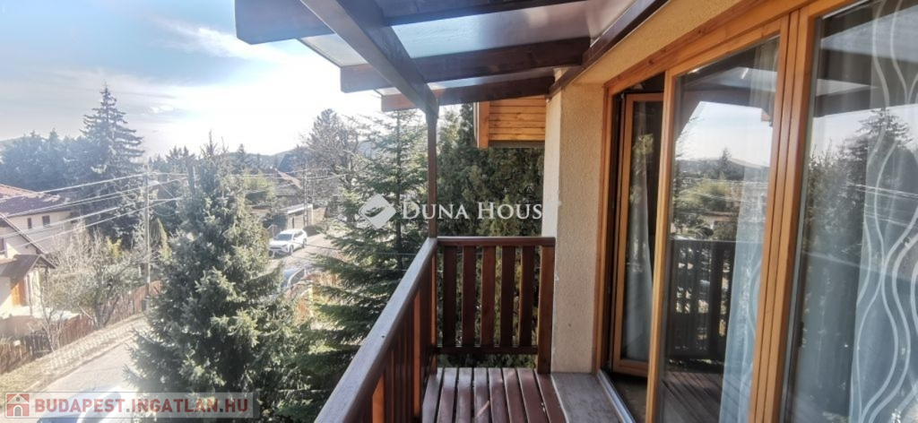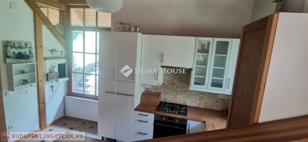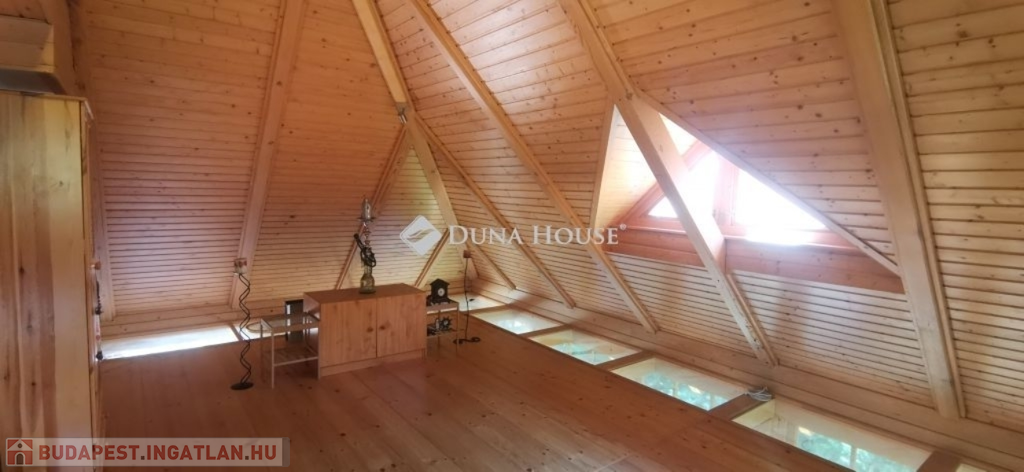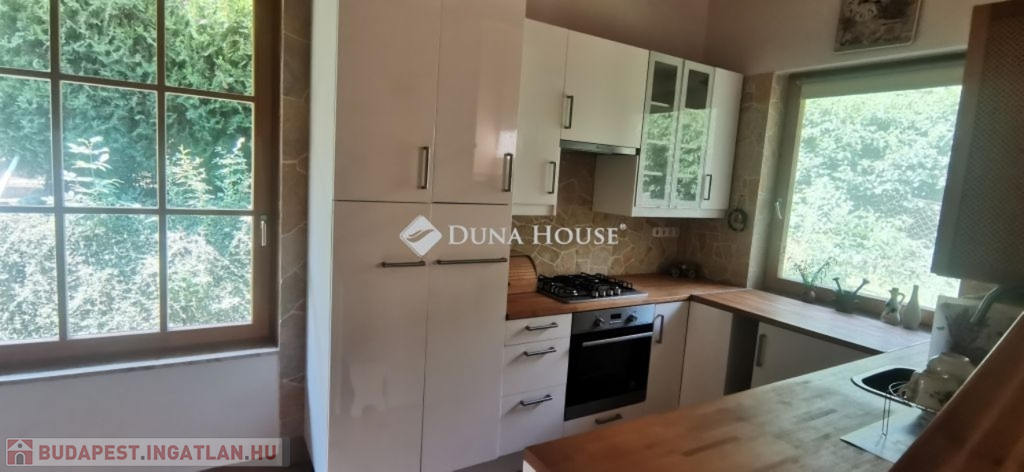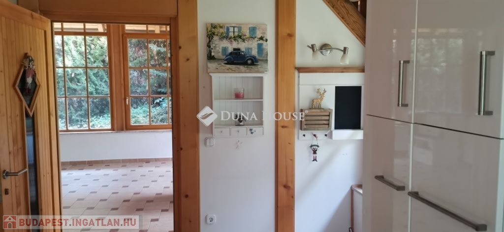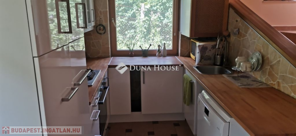 A ház 2005-ben épült, egyedi kialakítású, tetőtér beépítéses, kétszintes tégla családi ház. Az ingatlan egyik nagy előnye, hogy akár két generáció együttélésére is alkalmas. Együtt de mégis külön! A házat egy hatalmas kert, borospince, nagyméretű garázs, valamint további autóbeállási lehetőség teszi még kényelmesebbé a nagycsaládosok számára.Fűtése, meleg víz ellátása gáz cirkóval megoldott, a földszinten padlófűtéssel kiegészítve.A két generációs házban az egyik lakrész 35 m2 nagyságú, a földszinten a bejárattól jobbra található, amely áll egy előtérből nyiló szobából, konyhából és fürdőszobából, wc-vel. A konyhából egy átadó ablak nyílik a nappaliban lévő étkezőasztal felé, amely a családi összejöveteken praktikus megoldás a vendégek kiszolgálására. A nappali különös hangulatát a három oldalán elhelyezkedő kazettás fa ablakok adják, melyek révén mintha közvetlenül a fák tövében ülnénk, miközben szemlélhetjük a természet zöldjét az énekesmadarak, a mókusok játékát. Igazán különleges érzés, bent vagyunk, de mégis kint érezzük magunkat!A másik lakrészhez tartozó konyha a tágas nappali túloldaláról nyílik, amely a hátsó kertre nyílik és az oldalkertre néz, modern és kényelmes U-alakú elrendezésével. Itt található még egy háztartási helység és egy wc mosdóval. Innen jutunk fel a kétkarú lépcsőn az emeletre, amely egy egy légterű, fenyőfával burkolt tetőtéri nappali dolgozósarokkal. Ez egy légkondcionálóval ellátott, napfényes, hatalmas belső tér, amely sok lehetőséget rejt magában, plusz érdekes megoldás, hogy körben üvegpadló van, amely a fölszinti nappalit is plusz természetes fénnyel látja el. Nagyon hangulatos, a fényképek nem adják vissza, hogy mennyivel növeli a térérzetet ez a különleges padló kialakítás.A felső szinten ezen kívül egy kisebb szoba, gyerekszoba található, melllette zuhanyzós fürdőszoba wc-vel és a hálószoba a teljes faltól-falig tartó diófa terasszal! Erről a fedett teraszról is lenyűgöző, örökpanorámás kilátás nyílik a budai hegyekre, amelyet a teljes szélességében eltolható nyílászárókkal élvezhetünk maximálisan. A kert hatalmas, kissé emelkedik felfelé a kert vége felé, felúton a domboldali borospince, amely egy földdel borított boltíves hobbit pince.A ház szigetelt, szépen bevakolt, nagyon jó állapotban van, a tulajdonosok építették a család részére, kezdetnek nyaralóként, aztán állandó lakhelyként szolgált. Jelenleg nem lakják az ingatlant, gyorsan birtokba vehető. A környék csendes, pár utcával odébb található buszjárat 10 perc alatt Hűvösvölgyben van, onnan a város fél óra alatt elérhető. A közelben óvoda, iskolák, kisebb boltok, éttermek, szolgáltatók megtalálhatóak és persze rengeteg kirándulási lehetőség.Nézzük meg együtt, ne maradjon le erről a hangulatos, egyedülálló ingatlanról! Töltse már itt a nyarat!