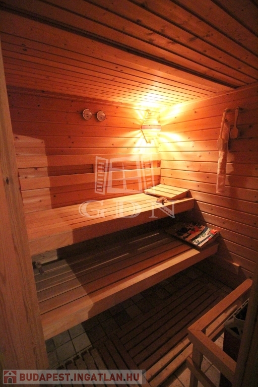 ALAGSOR: 2 állásos garázs mellett, fitness terem, 4 fős szauna, zuhanyzó, külön helyiségben a mosókonyha, gépészeti helység.