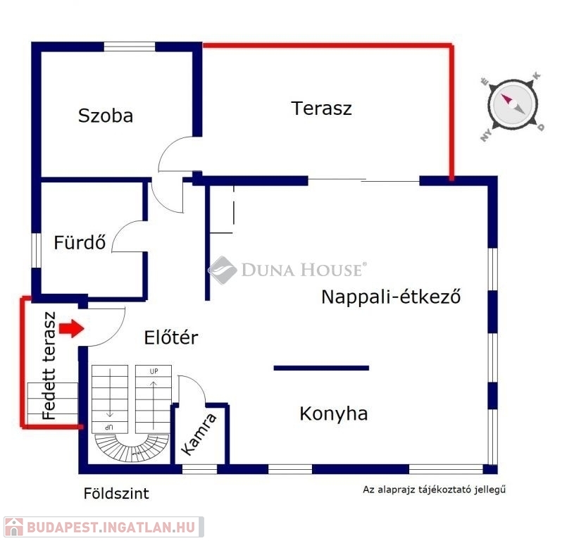 A belső lépcsőn a földszintre érkezünk, mely tágas, étkezős nappaliból és részben szeparált konyhából áll, kamrával. A nappalihoz kapcsolódó nagy terasz és a csodás kert kellemes helyszín a kikapcsolódáshoz. A földszinti háló és fürdőszoba lehetőséget ad akár egy vendég elhelyezésére, akár otthoni munkavégzésre.