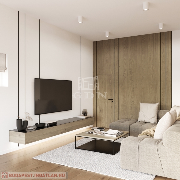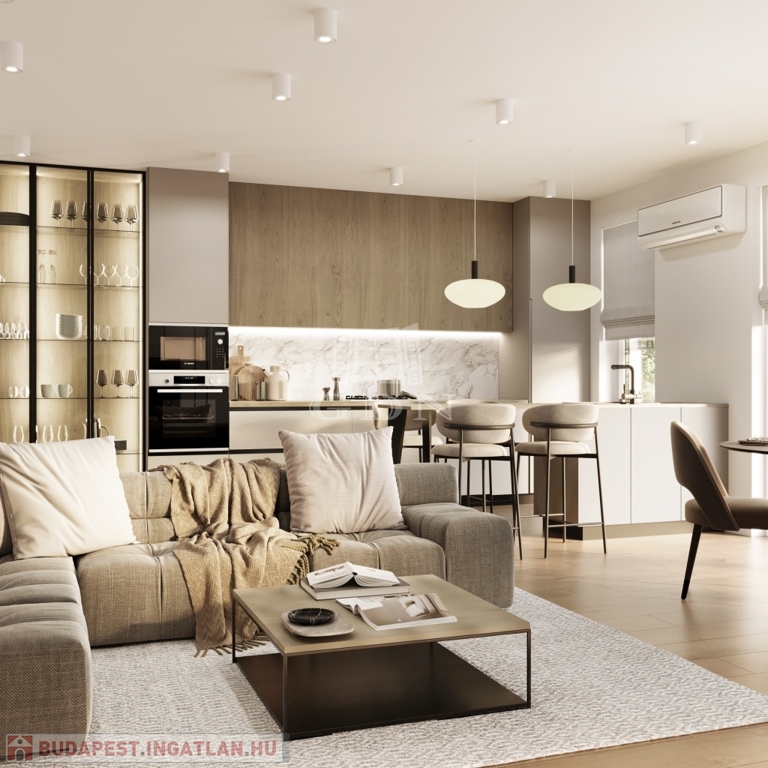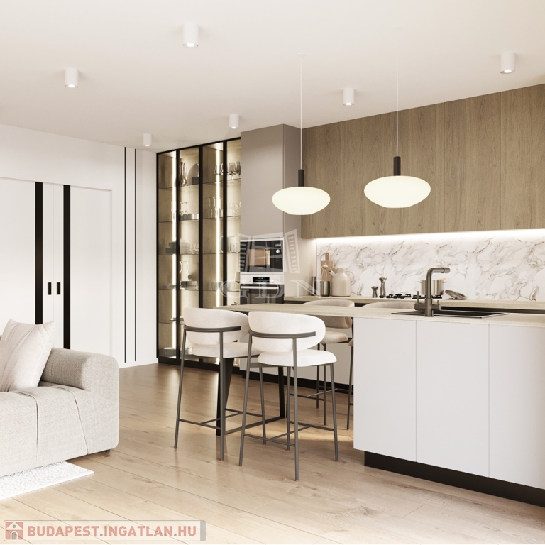 A lakás felszereltségéhez tartozik a teljes konyhabútor Bosch berendezésekkel, ebédlőszigettel, valamint a nappali polcrendszere a belsőépítészeti terveknek megfelelően.