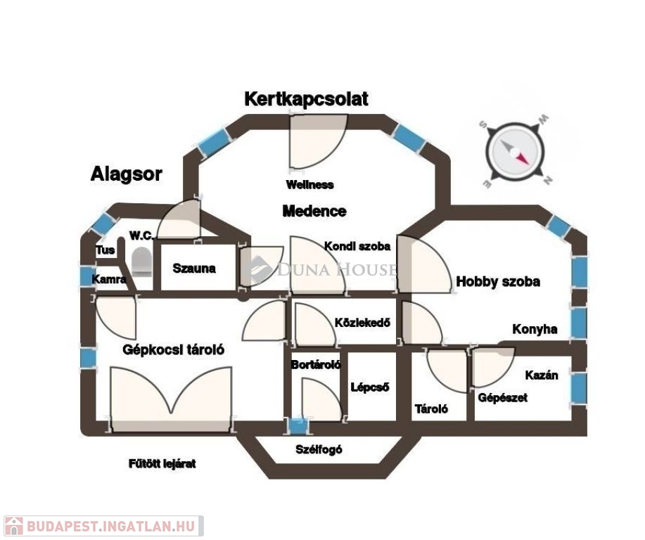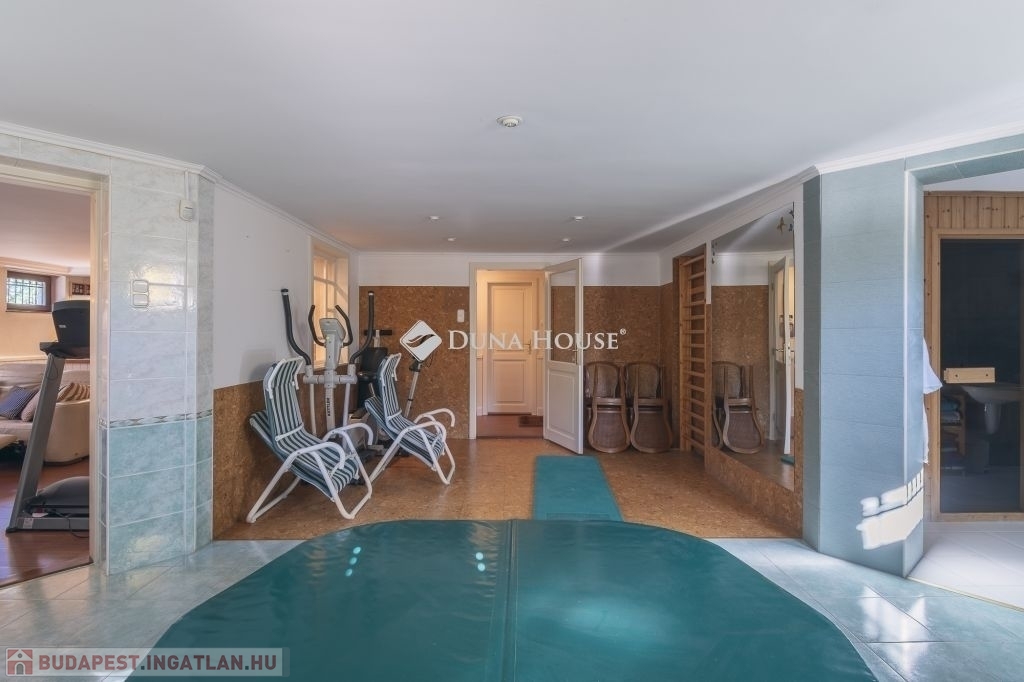 A családi ház átgondolt tervezés eredményeként az alsó szinten található 2 állásos gépkocsi tárolóval, jacuzzi, szauna, kondi- és hobby szoba, bortároló, kamra, tároló, mosó- és szárító helyiség, további tárolóval. Kertkapcsolatos ez a szint, így a privát napozó teraszra léphetünk ki innen.