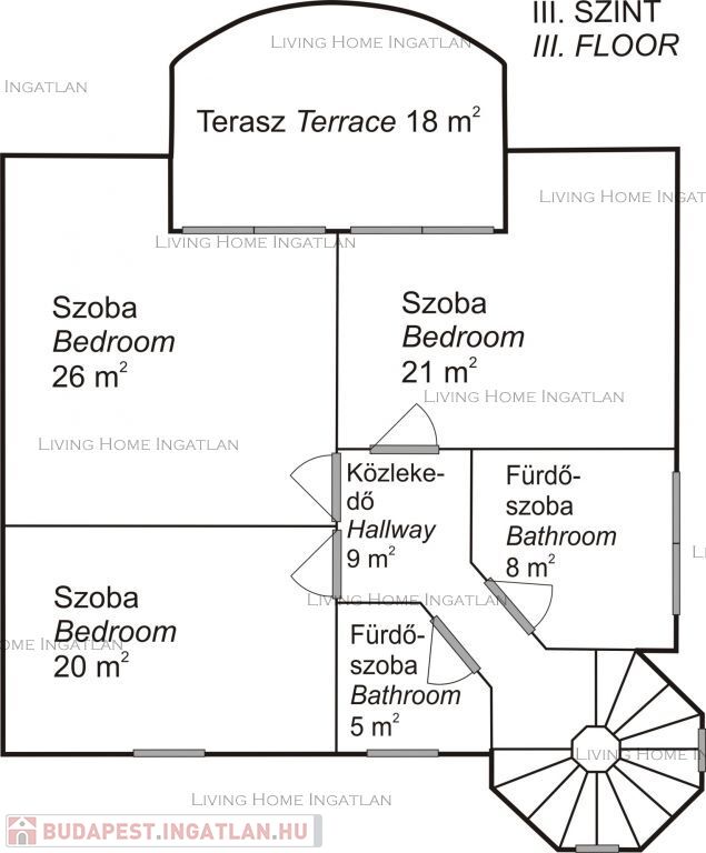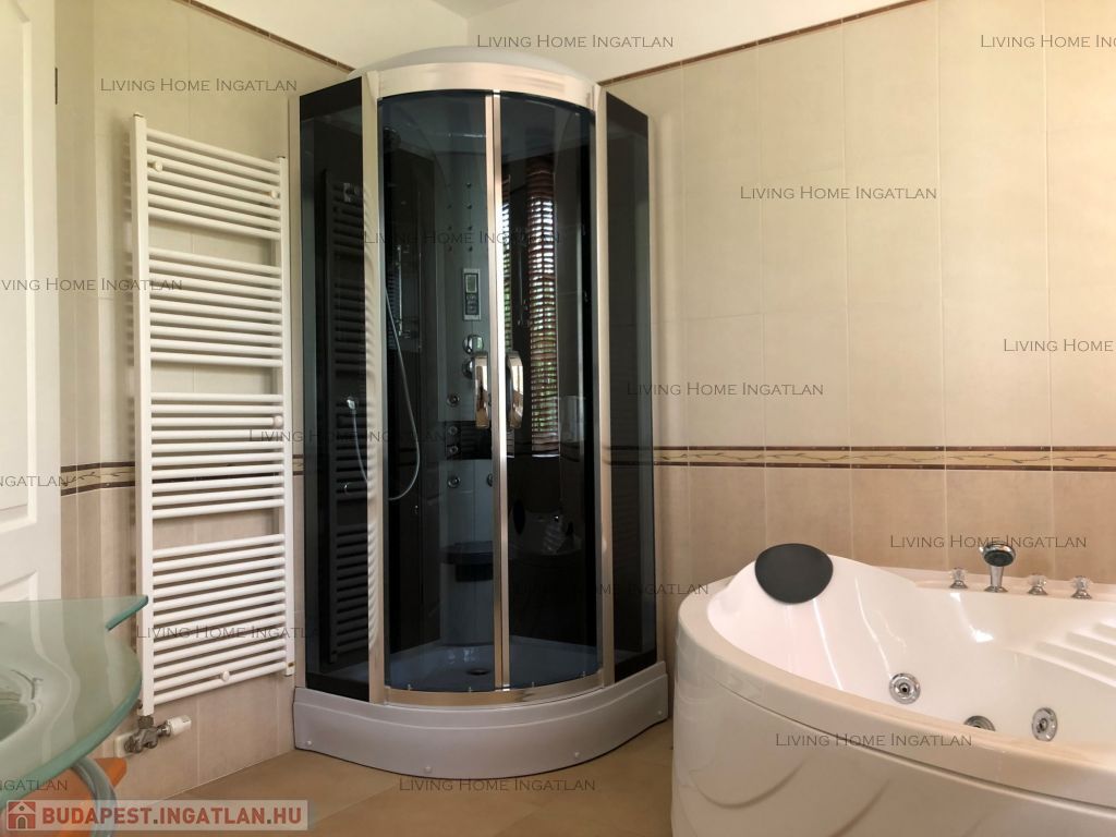Emelet: Itt 3 szoba helyezkedik el örökpanorámás erkéllyel, mindenhol beépített gardróbszekrény, 2 fürdő tusolóval és káddal.