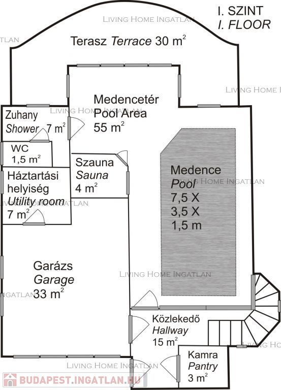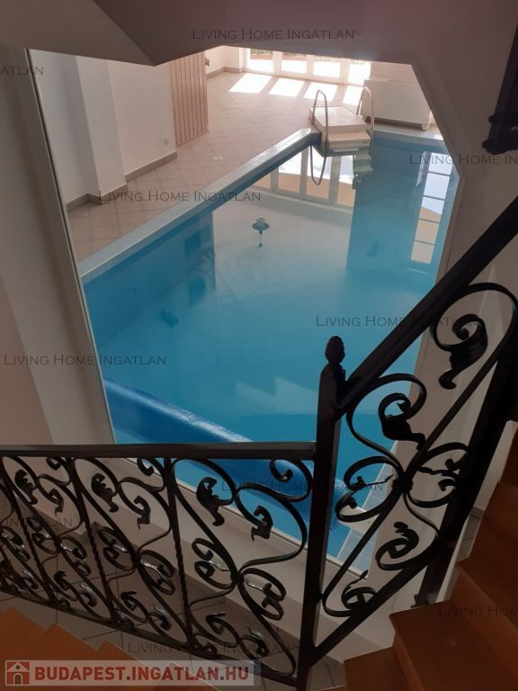 Alsó szint: Kertkapcsolatos wellness-részleg: 30 nm-es napozó-pihenő terasz, fűtött belső medence ellen áramoltatóval, led-fényekkel, finn szauna, öltöző, fürdő, WC, gépészeti helyiség, (központi porszívó, kazán, mosókonyha), tároló. Itt található a 2 állásos garázs is fűtött lehajtóval, elektromos garázskapuval.