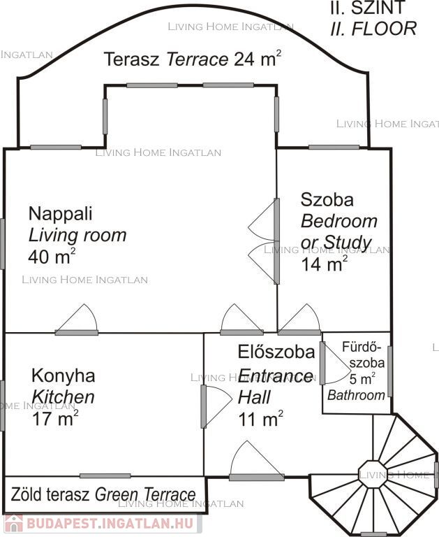 Földszint: Körpanorámás nappali 24 nm-es erkéllyel, étkező, vendégszoba, gépesített, felszerelt konyha, fürdő.