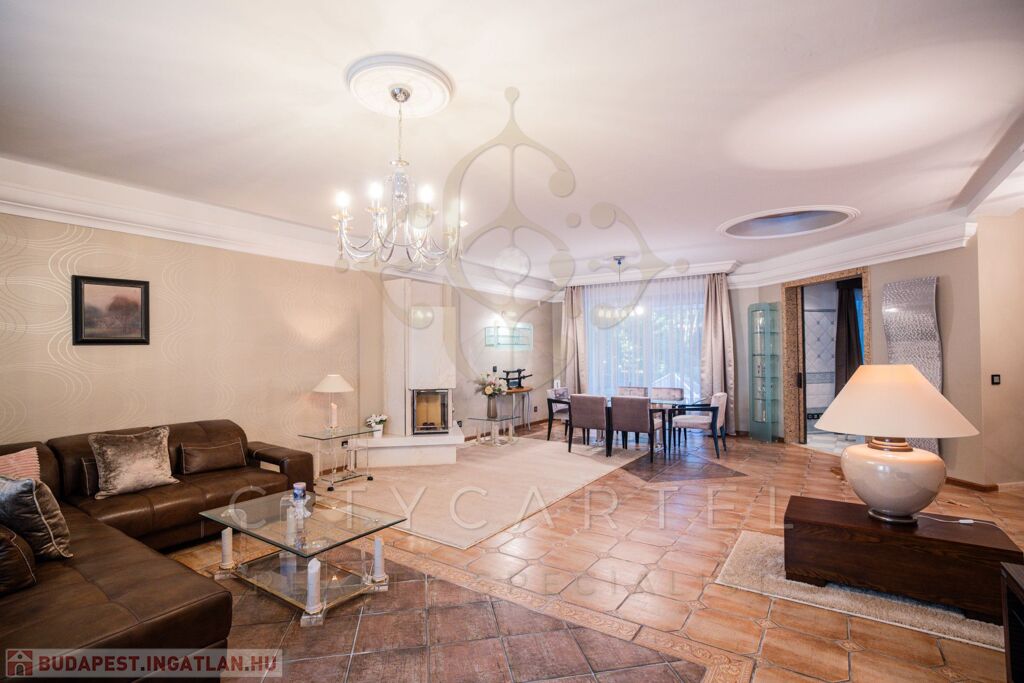 Tágas (~57 nm) fényárban úszó terasz- és kertkapcsolatos, étkezős nappali Dolby Surround kiállásokkal a falakban, carrarai márványból készült kandalló (minősített kéménnyel), benne szintén carrarai márványból készült térplasztika és egyben csobogó.