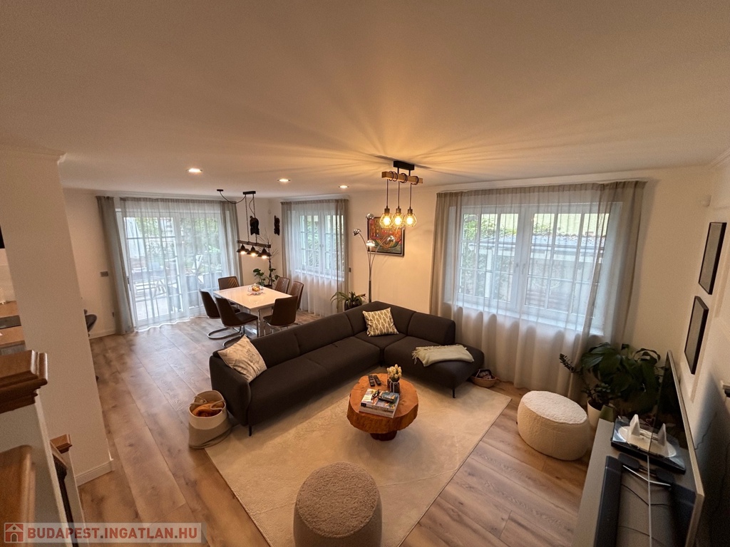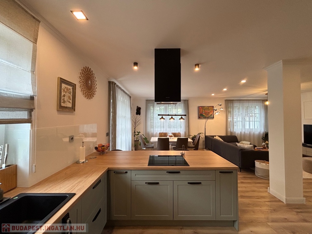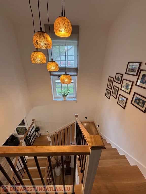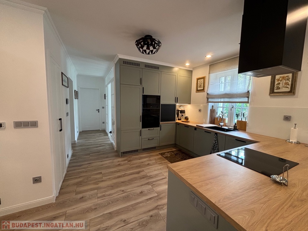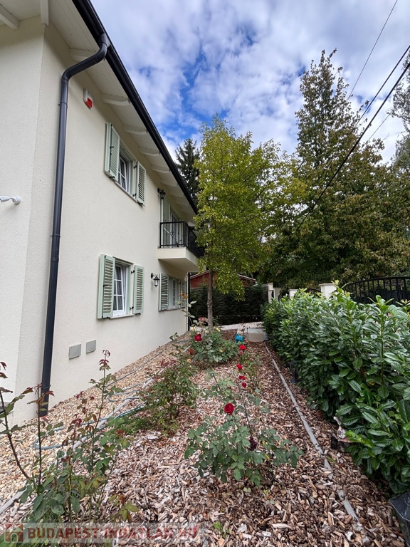 Kivételes lehetőség a II. kerület egyik legkeresettebb részén! Eladó egy frissen elkészült, amerikai stílusú luxusvilla, amely modern eleganciájával és kimagasló műszaki tartalmával valódi ritkaság a piacon. Főbb jellemzők: Nettó alapterület: 205 m² Terasz: 50 m² + minden szobához 4–6 m² erkély Telek mérete: 800 m², parkosított kert Elrendezés: kétszintes, átgondolt alaprajz, tágas terek ✨ Belső kialakítás: A földszinten elegáns előtér, világos, amerikai stílusú konyha–étkező–nappali egy légtérben, mely a családi élet központja. Ezen a szinten található egy vendégszoba saját fürdővel és WC-vel, kamra, tároló és gépészeti helyiség. Az emeletre vezető impozáns lépcső egy három hálószobás részhez érkezik, mindegyik saját fürdőszobával és erkéllyel. Két hálószobához külön gardrób, valamint mosókonyha és közlekedő is tartozik. ⚙️ Felszereltség és technológia: Daikin hőszivattyú (H-tarifa) Távvezérelhető padló- és mennyezetfűtés/-hűtés, helyiségenként szabályozható Riasztó, IP kamerarendszer Központi porszívó, vízlágyító Robotfűnyíró, automata öntözőrendszer Külső tér és extrák: A gondosan parkosított kert nyugalmat és intimitást biztosít. Kétállásos fedett gépkocsibeálló elektromos kapuval és autótöltő előkészítéssel Kültéri műhely / motortároló Dél–nyugati fekvésű, tágas terasz – tökéletes pihenésre és vendégfogadásra Ez az ingatlan a modern luxus, a kényelem és a zöldövezeti élet tökéletes harmóniáját kínálja. Tökéletes választás azoknak, akik prémium minőségű, új építésű otthont keresnek Budapest egyik legnyugodtabb, mégis központi részén.