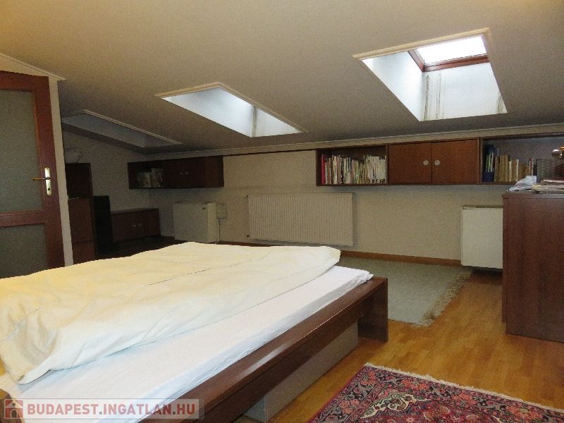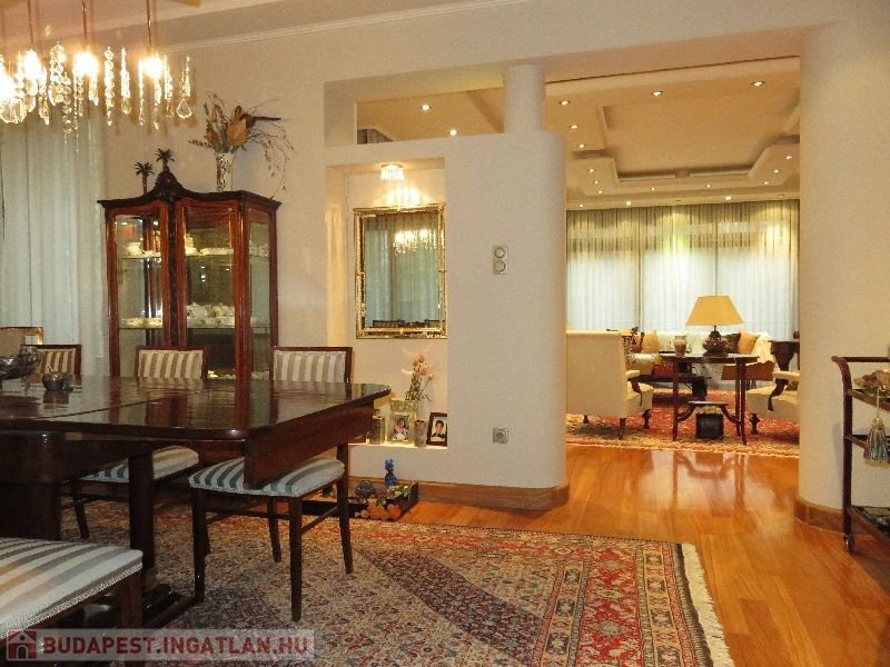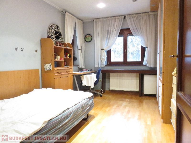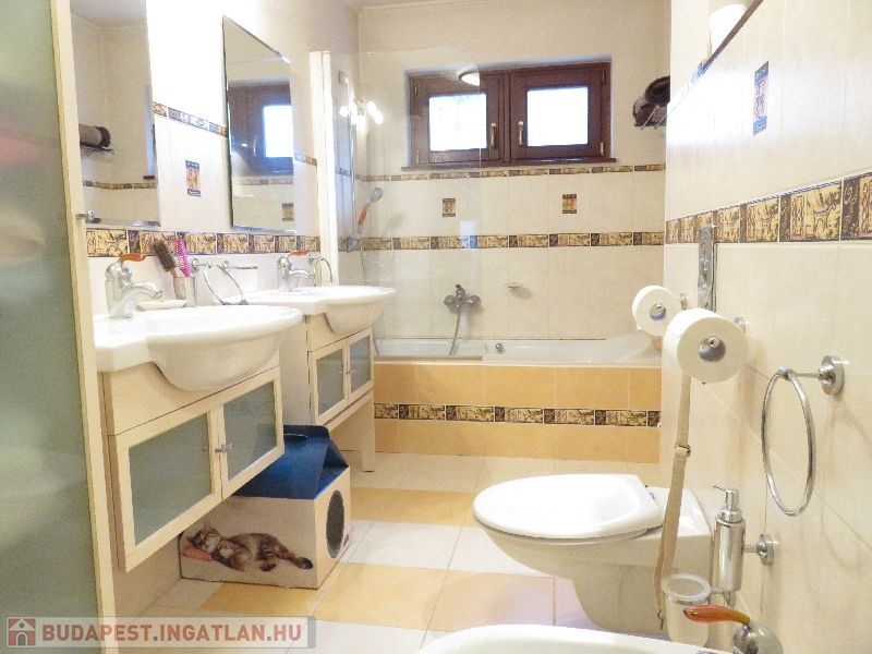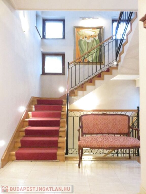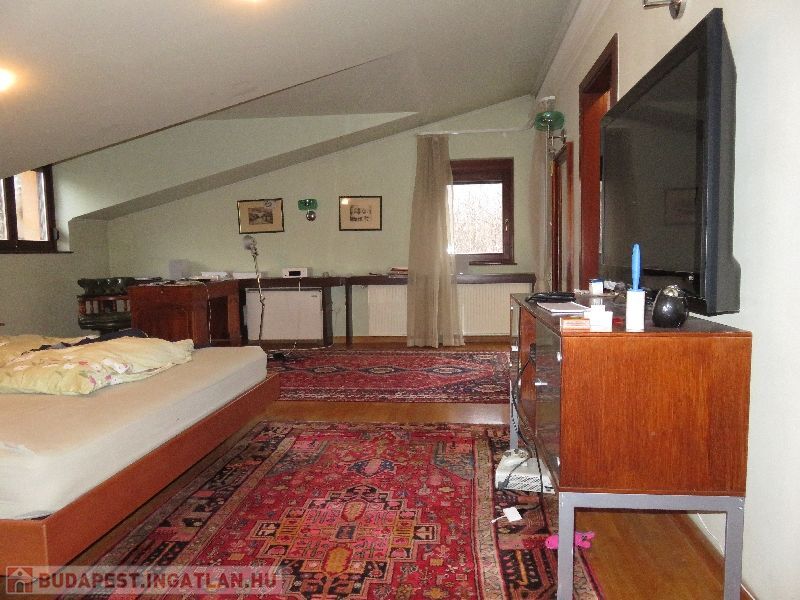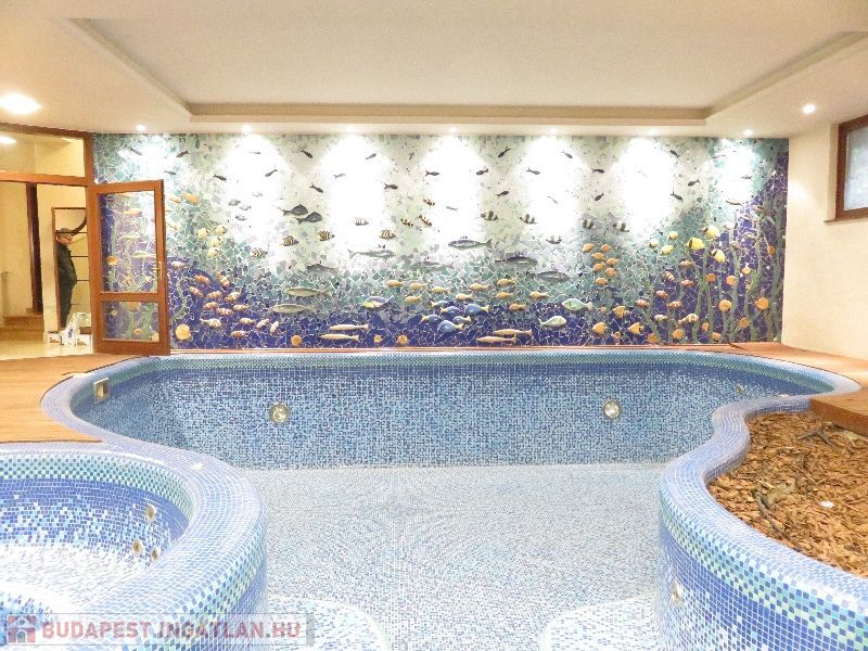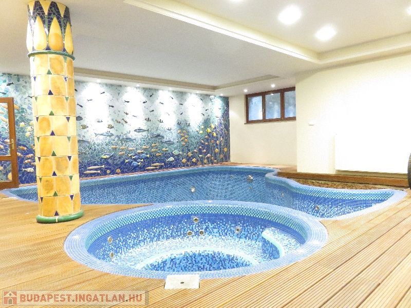 II/A Máriaremete csendes utcájában 2001-ben a legkorszerűbb anyagokból épült 600 m2 + 100 m2 teraszos, 2 nappali + 6 szobás, kubai stílusban berendezett, klimatizált, felújítandó családi ház duplagarázzsal, egyedi úszómedencével, jacuzzival, szaunával, 2 légkamrás fa nyílászárókkal, trópusi fa burkolatokkal eladó.