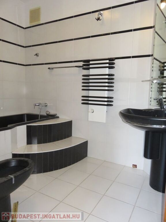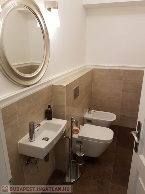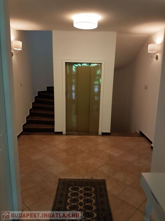 A belső ajtók műbútor minőségű cseresznye furnéros kivitelűek, a lépcsőház tiszta gránit, az elegáns fürdőszobák Villeroy & Boch szaniterekkel készültek. Vendégeknek a pince szinten lévő kiszellőztethető személyzeti konyhában lehet főzni, és nem lesz ételszag a lakásban. A nappaliban és az emeleti hálókban légkondi működik. Az ikerház mindkét felében saját külön hidraulikus működtetésű zajtalan lift működik a pincétől a tetőtérig.