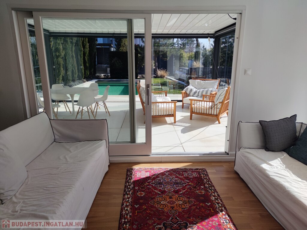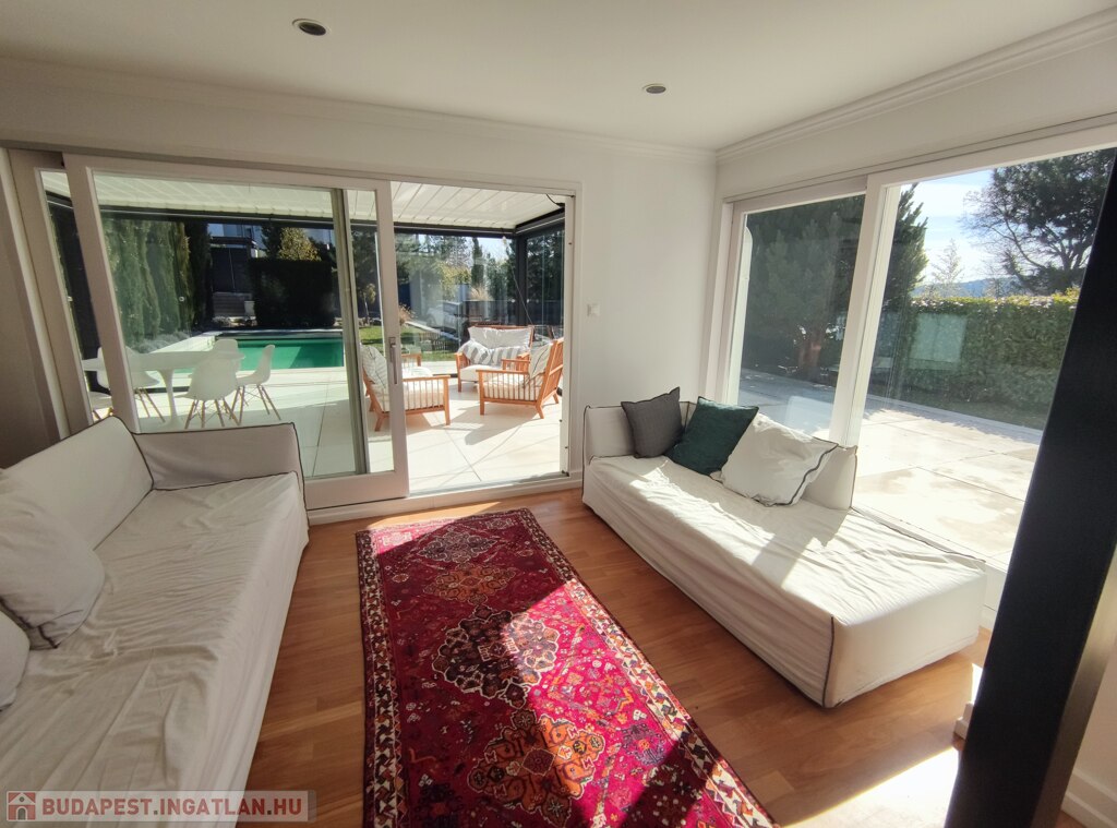 The 3-storey, beautiful house, built in the early 2000s on a quiet, intimate plot, faces southeast. In 2019, during the renovation, a spacious, glazed covered terrace/winter garden was added, a heated pool was installed, and the sanitary facilities and built-in wardrobes were replaced.