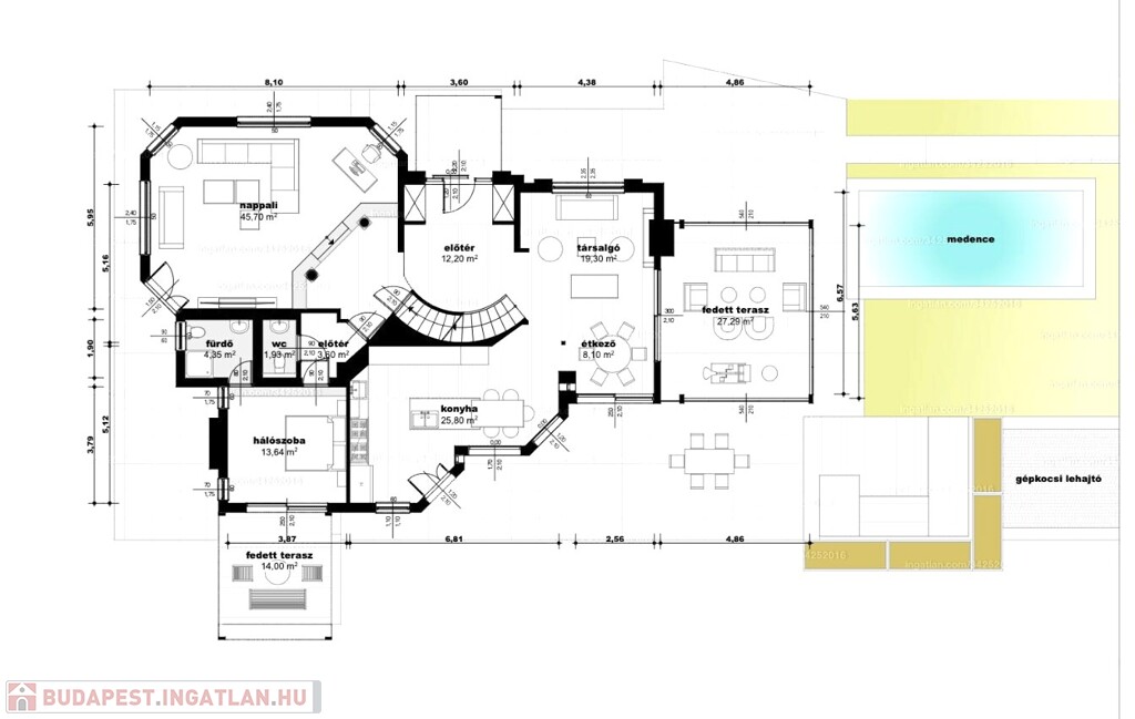 földszint: hatalmas nappali, 1 hálószoba fedett terasszal, fürdőszoba, vendég wc, beépített, gépesített konyha, étkező, társalgó kandallóval, üvegezett terasszal, fűthető medence és napozóterasz, gondozott kert