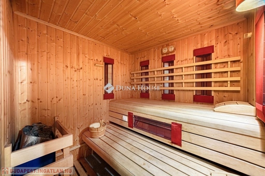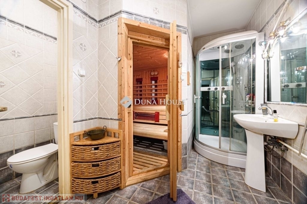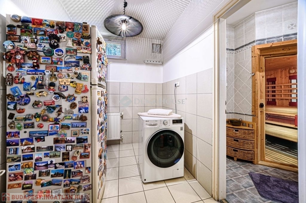 Az alsó szint valódi különlegesség: wellness részleg fin- és infraszaunával, zene szoba, mosókonyha, valamint további kiszolgáló helyiségek szolgálják a kényelmet és a kikapcsolódást. A három szinten végig gondosan megtervezett tárolók és gardróbok diszkréten simulnak bele az enteriőrbe.