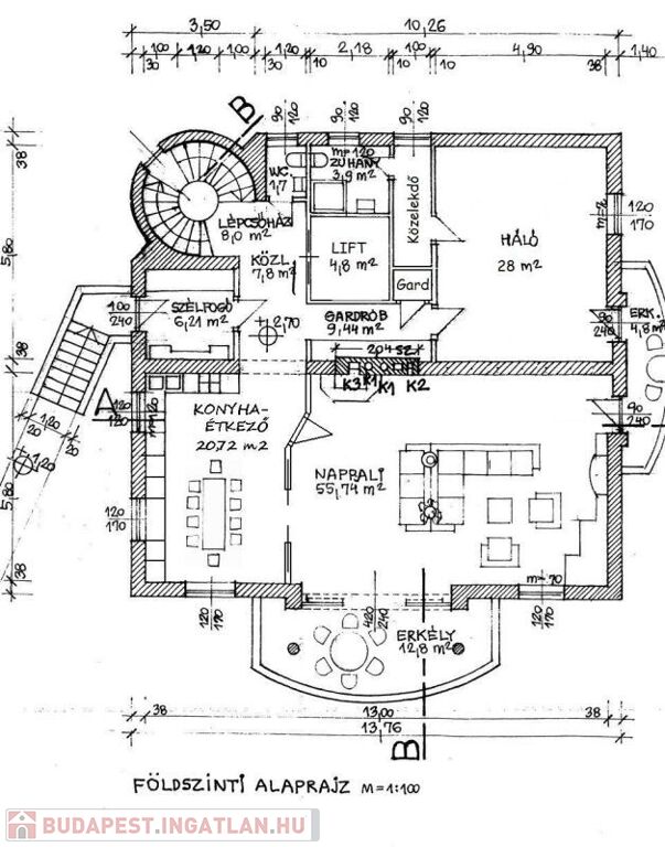 * Magasföldszint 144,5 + 17,6 m2: nappali (55,74m2), konyha-étkező (20,72), hálószoba (28 ), lift (4,8 m2), gardrób (9,44), zuhanyzó (3,9), szélfogó (6,21), közlekedő (7,8), lépcsőház (8), terasz (12,8), terasz (4,8); belmagasság: 2.80 m