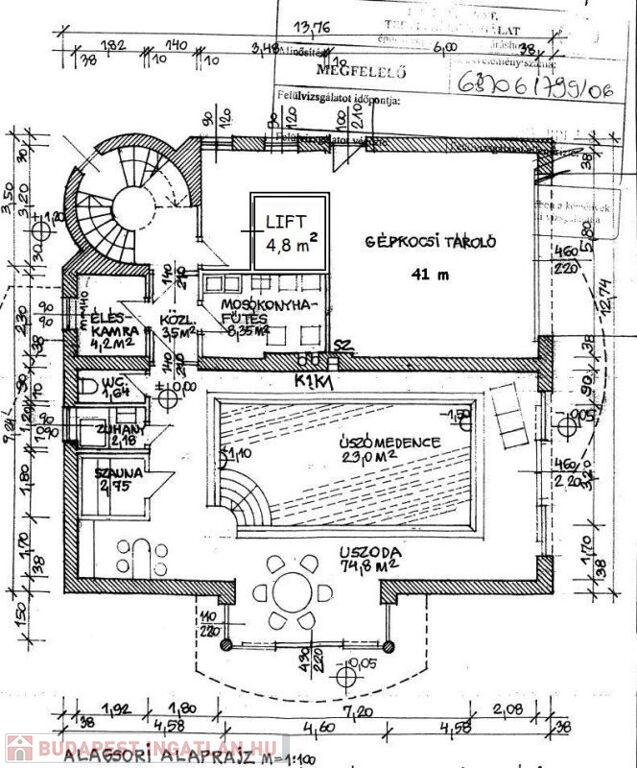 * Kertszint 143,4 m2: uszoda(74,8 m2), dupla garázs(41 m2), lift (4,8 m2), szauna(2,75), zuhany(2,18), WC (1,64), kamra(4,2), háztartási helyiség(8,35), közlekedő(3,5), kertkapcsolat; belmagasság: 2.70 m