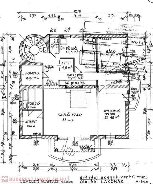 * Emelet 144,35 + 17,6 m2: 3 hálószoba (33 m2; 21,46 m2; 15,17m2), 2 fürdőszoba (13,6 m2; 8m2), konyha (6,21), gardrób (13,25), lift (4,8), külön WC (2,2), közlekedő (10,8) terasz (12,8), terasz (4,8), lépcsőház (8); belmagasság: 2.80 m