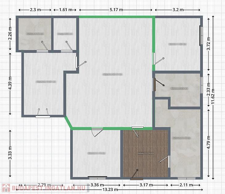 Az ingatlan elosztása 3 szobából egy amerikai konyhás nappaliból, 2 fürdőszobából, gardróbból és mosókonyhából áll.
