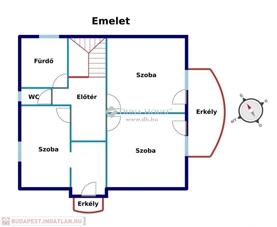 Kényelmes magasságú, széles lépcsőn juthatunk fel az emeleti közlekedőbe, innen léphetünk be mindhárom hálószobába, amelyekhez erkély is tartozik. Továbbá itt az emeleti fürdőszobában kényelmes méretű kád található, wc szintén külön helyiségben.