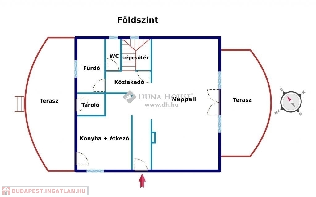 A ház középpontja a rendkívül tágas, 44 nm-es nappali, amihez egy 22 nm-es terasz kapcsolódik. Szintén a földszinten található külön helyiségben a konyha, ami méretének köszönhetően az étkezőt is magában foglalja. Ugyanitt tágas, nagy ablakos fürdőszoba zuhanyfülkével található, a wc külön helyiségben van.
