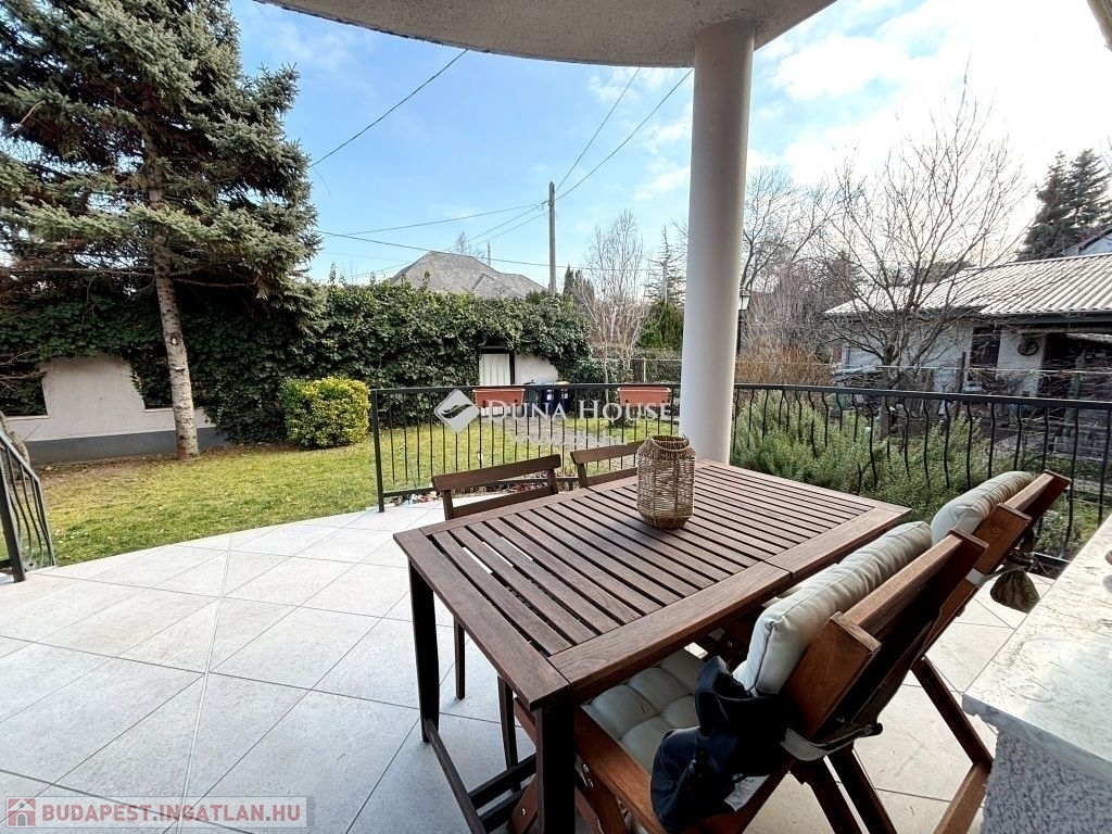 A füvesített, automata öntözőrendszerrel kiépített udvar bokrokkal, örökzöldekkel és egy fenyővel tarkított kellemes hangulatú hely, ahova a széles 22 nm-es földszinti terasz, illetve az emeleten található 14 nm-es erkély nyílik.