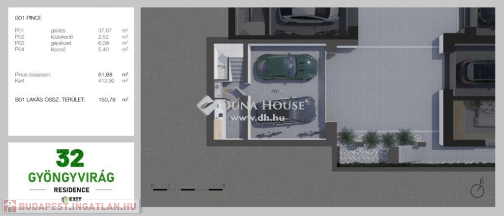 A házakhoz SAJÁT KÉTÁLLÁSÚ GARÁZS és 250-450 nm területű INTIM SAJÁT KERT tartozik, amelyek pihenésre, napozásra kiválóan alkalmasak.