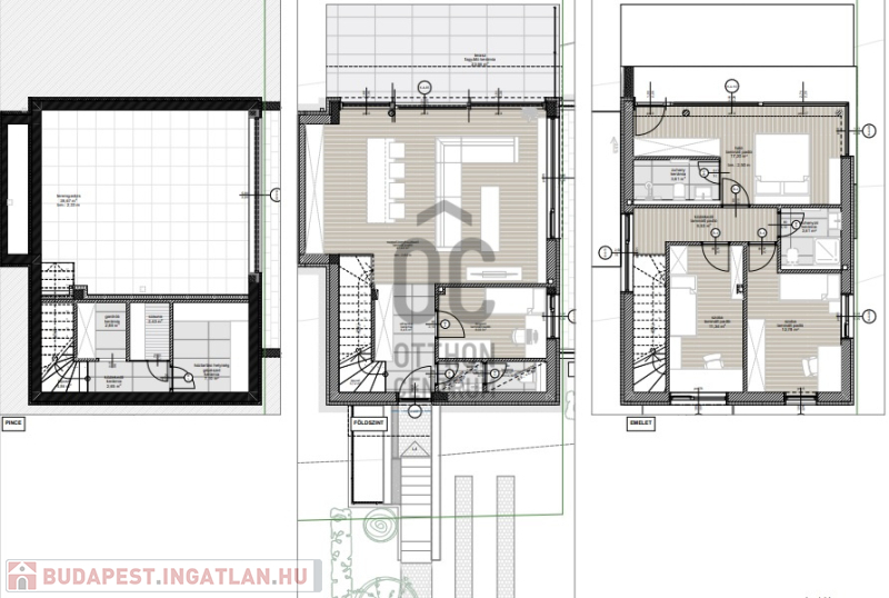 Sajátossága, hogy belső három szintes, ahol a pinceszinten a dupla állásos garázs mellett található a háztartási helyiség, tároló, szauna.