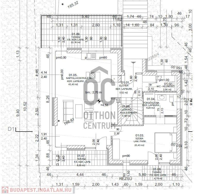 A házhoz tartozik 55 nm burkolt terasz, valamint 27 nm zöldtetős terasz.