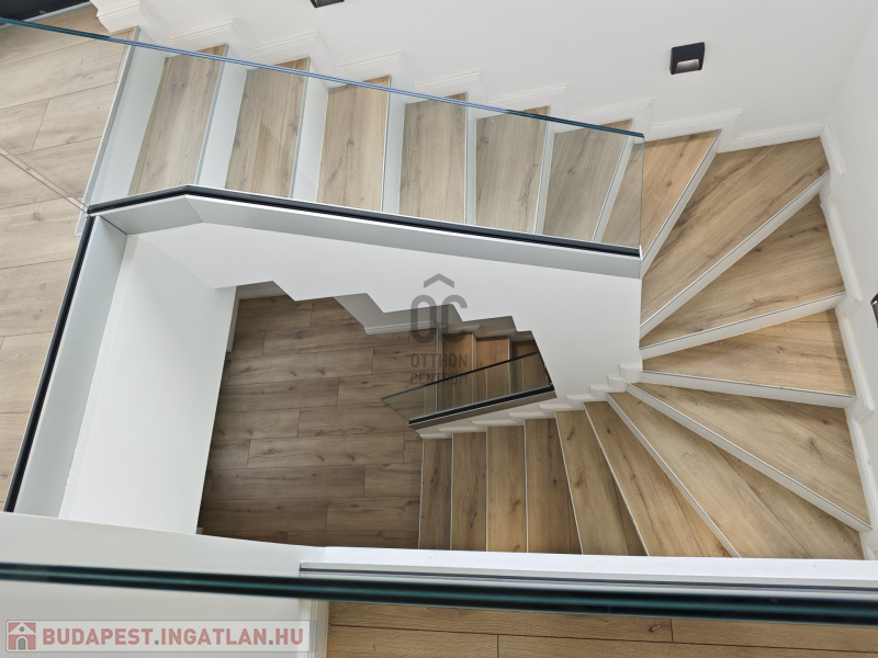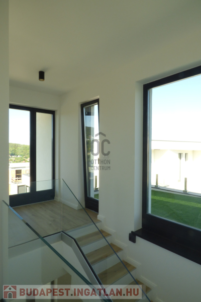 Az emeleten három hálószoba, gardrób és nagy fürdőszoba valamint egy óriási panorámaterasz található.